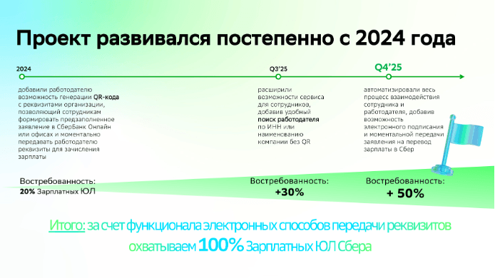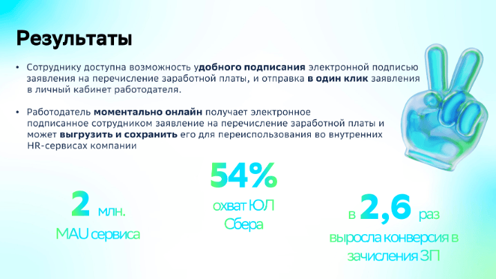 Итогом проекта стал охват 100% ЮЛ сбера, электронными сервисами позволяющими упростить процесс работы с начислением заработной платы сотрудникам, а сотрудники получили инструмент, позволяющий значительно сократить время и путь становления зарплатным клиентом.