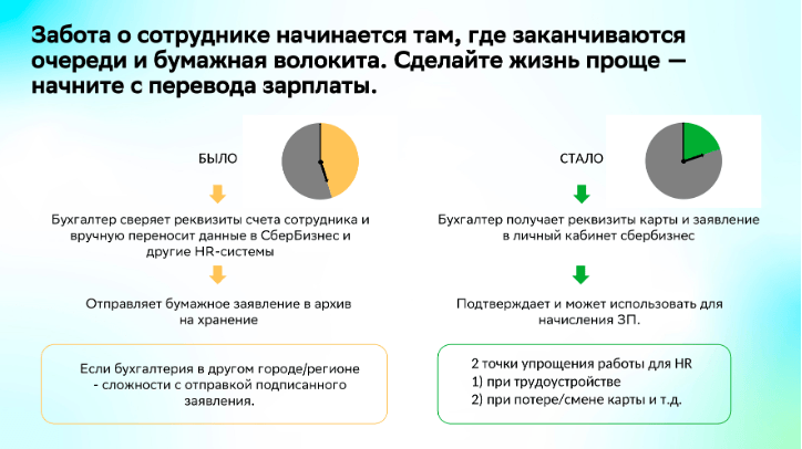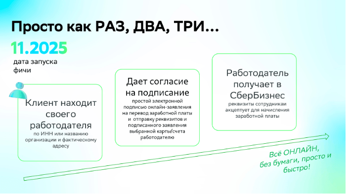 Мы решили проблему и разработали возможность онлайн подписания заявления на перечисление заработной платы простой электронной подписью и онлайн-передачи его в личный кабинет СберБизнеса, что при наличии КЭДО в компании сохраняет легитимность документа и освобождает работодателя от необходимости ожидания и хранения бумажных заявлений.