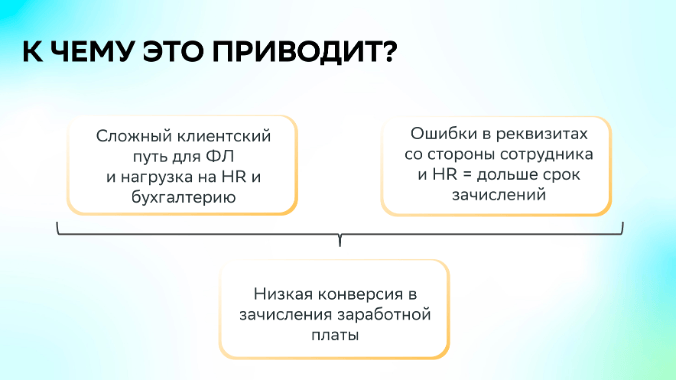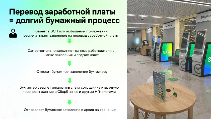 Оставалась проблема обязательного наличия, с законодательной точки зрения, собственноручно подписанного заявления на перевод заработной платы, которое сотруднику необходимо было распечатать, подписать и передать работодателю. Процесс занимал время, а в процессе заявление терялось, портилось и клиентский путь был сложным и неудобным.