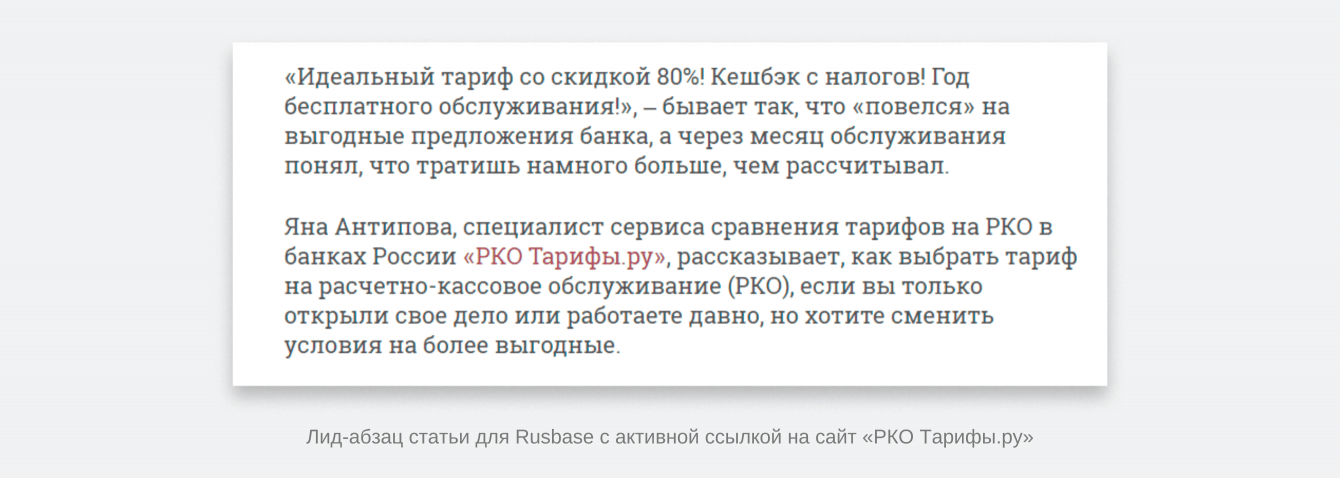 Заранее договорились с редакциями о вставке активной ссылки на «РКО Тарифы.ру» в лид-абзац, био эксперта или текст статьи.