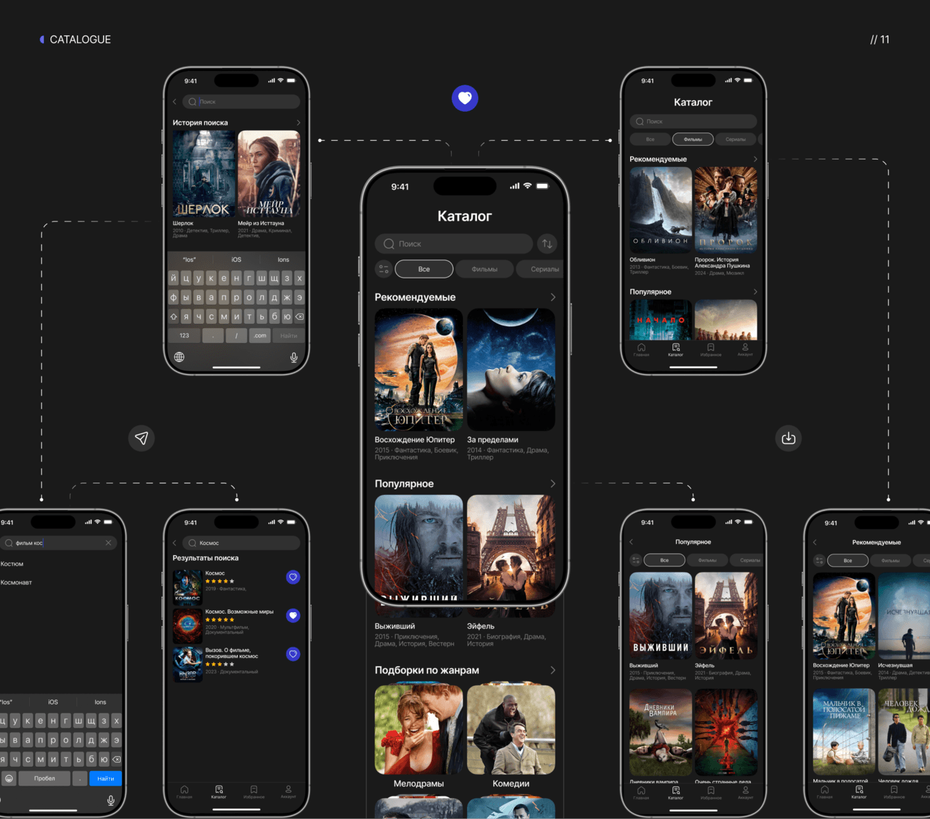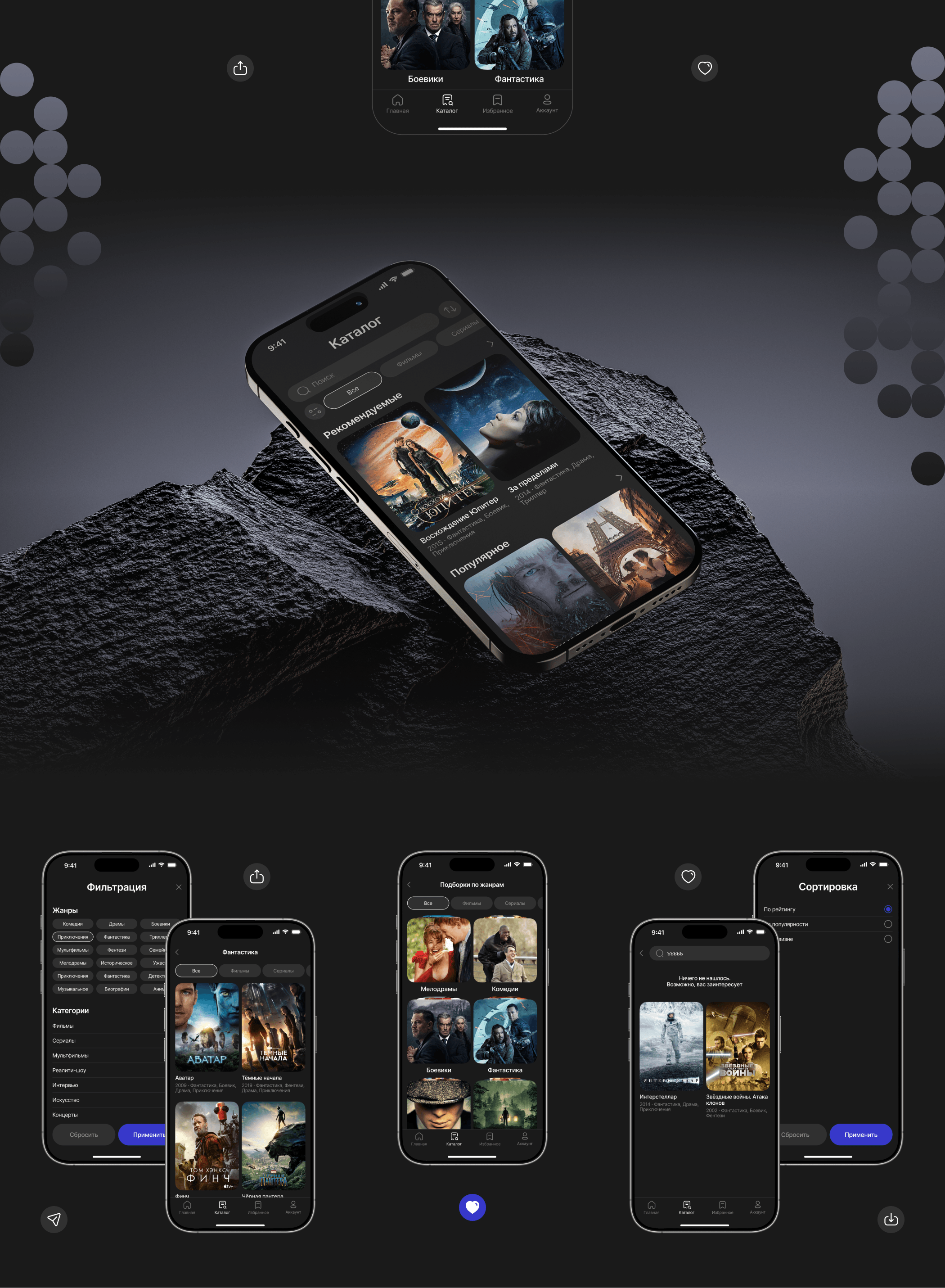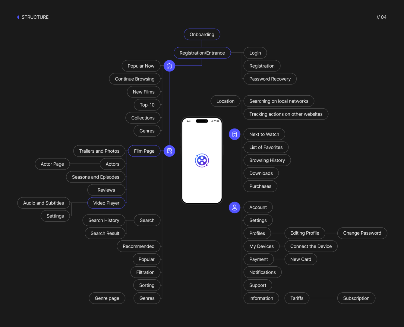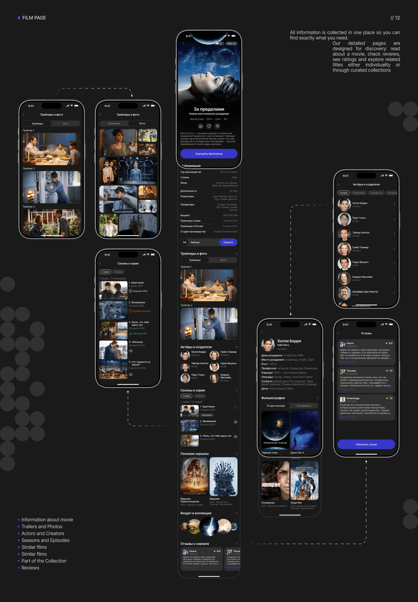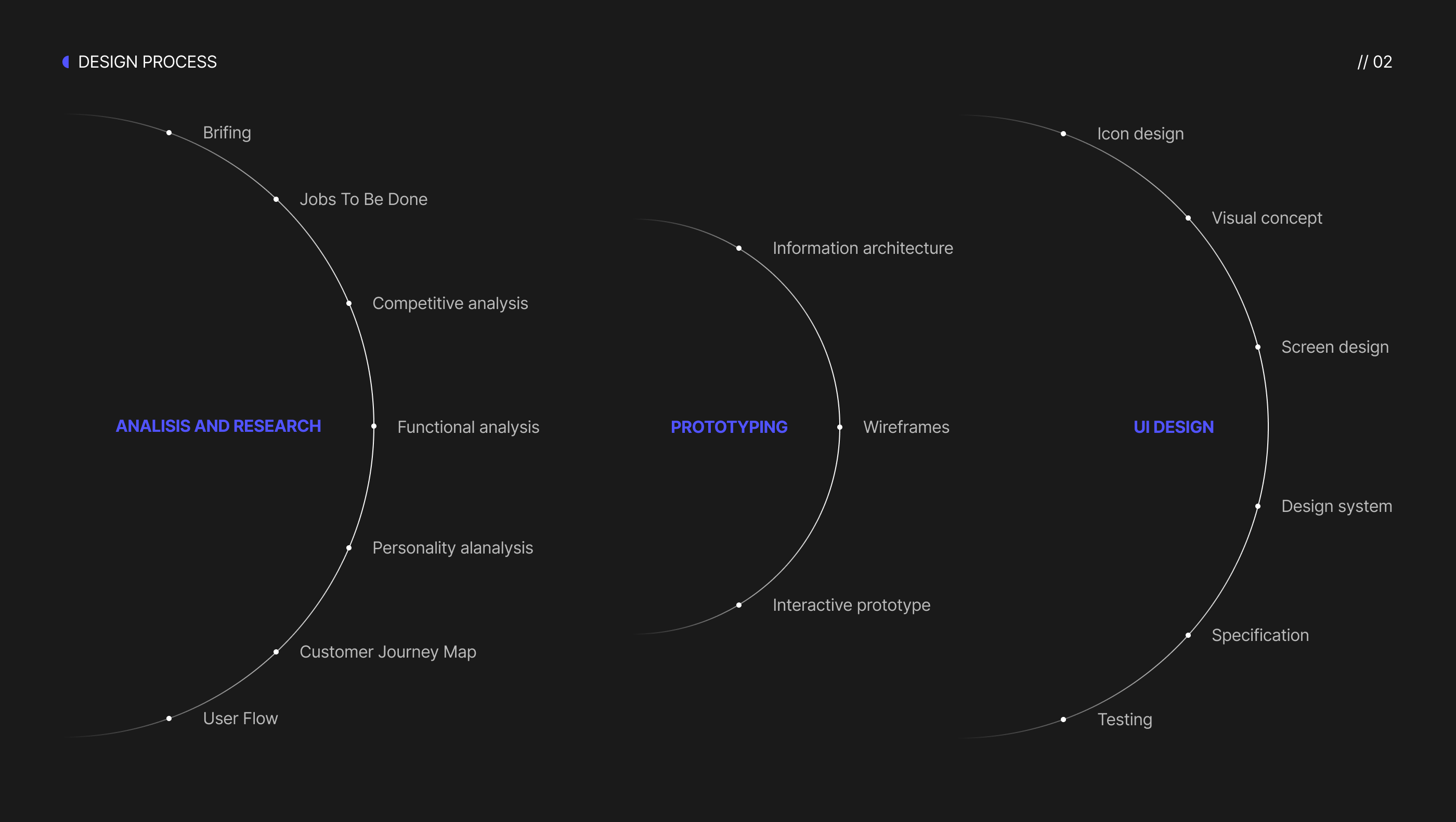 Этапы работы: Брифинг, аналитика и исследования, структура приложения и прототип, референсы, визуальная концепция, дизайн всех экранов, дизайн-система, передача макетов в разработку.