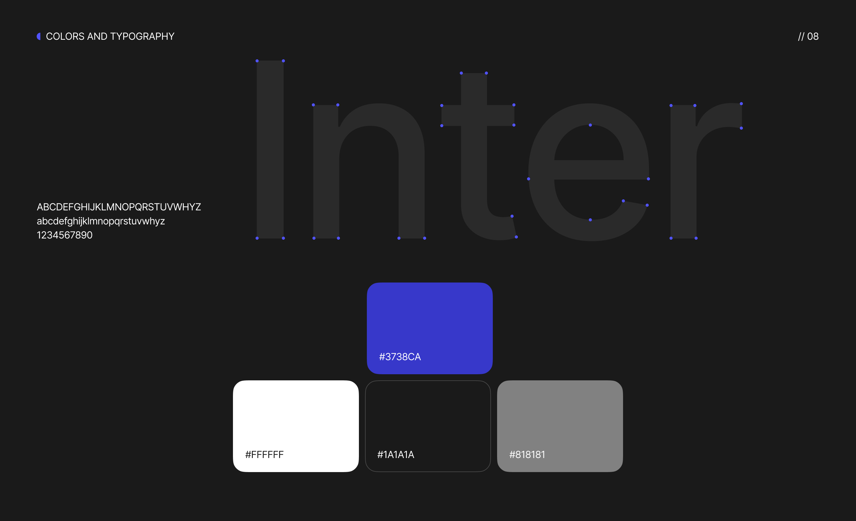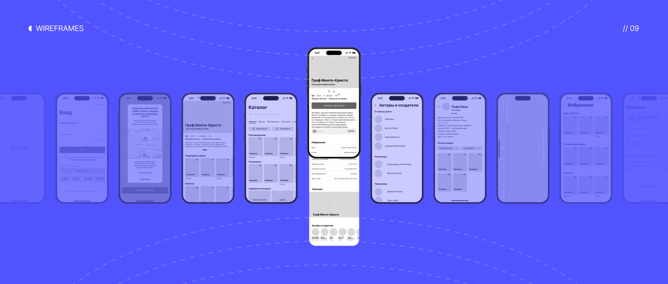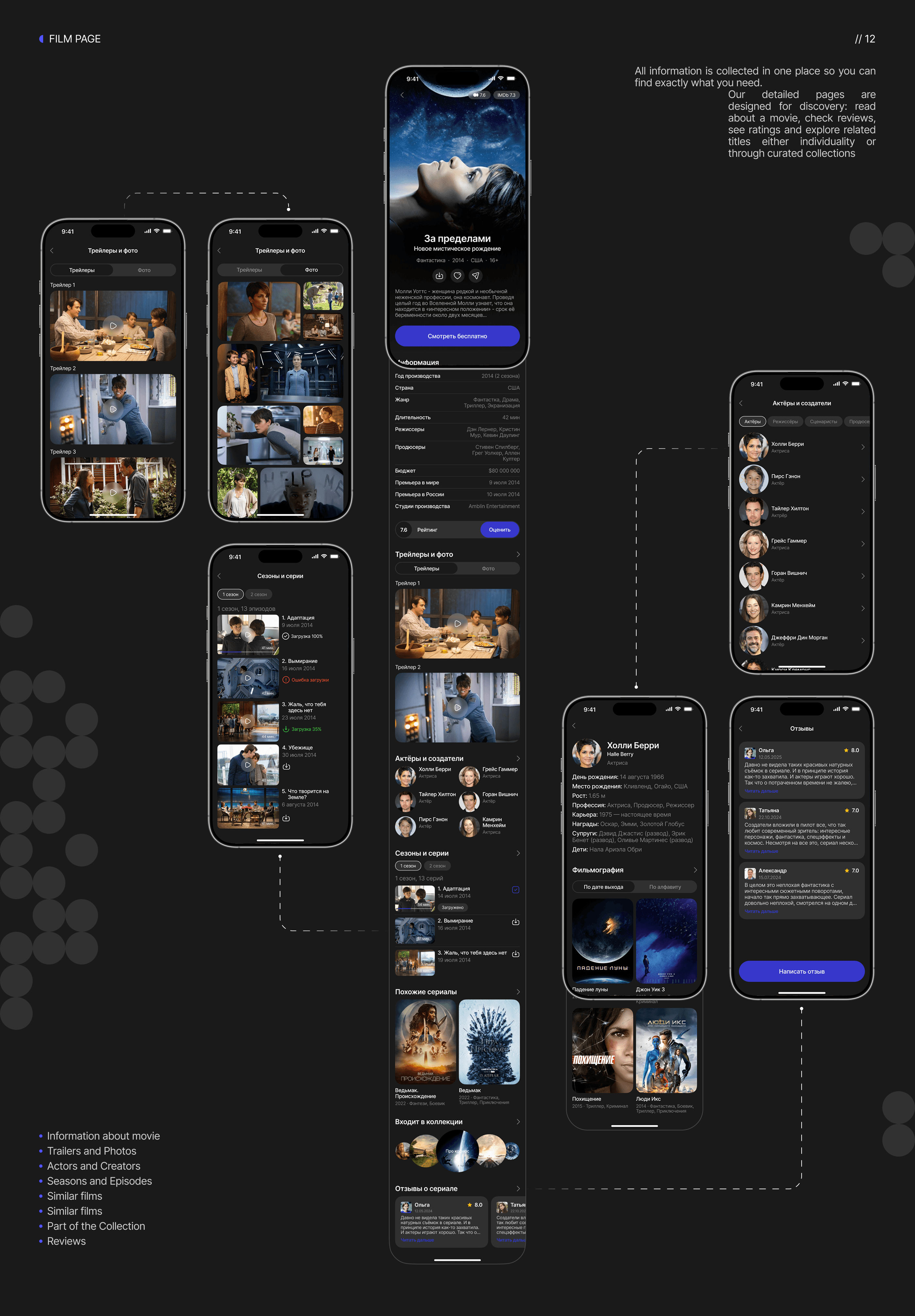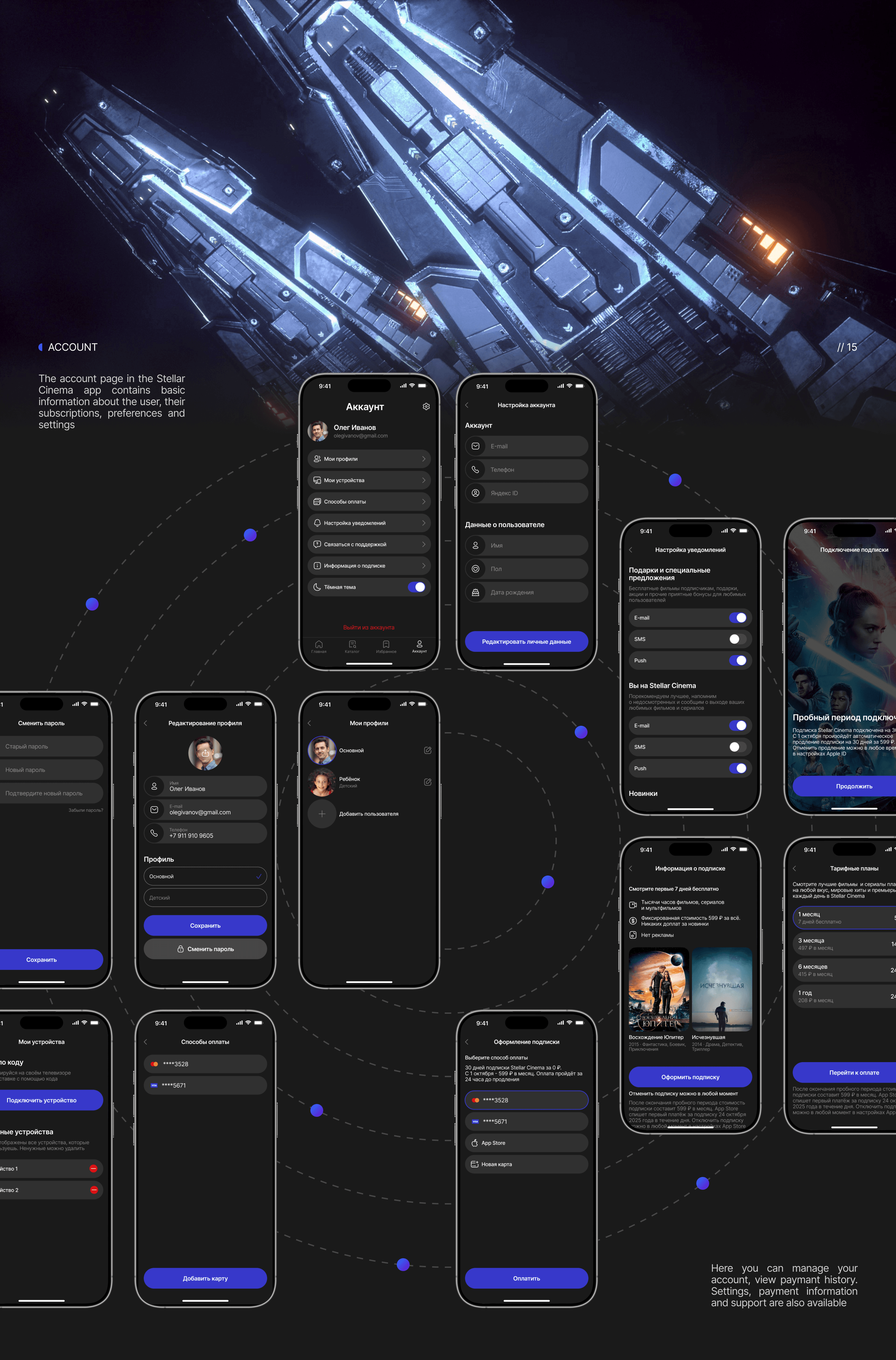 Визуальная концепция: Были отрисованы все основные экраны по целевому сценарию. Интерфейс был разработан в темной и светлой темах, в качестве акцентного цвета выбран ярко-синий. Для текста использовался шрифт Inter.