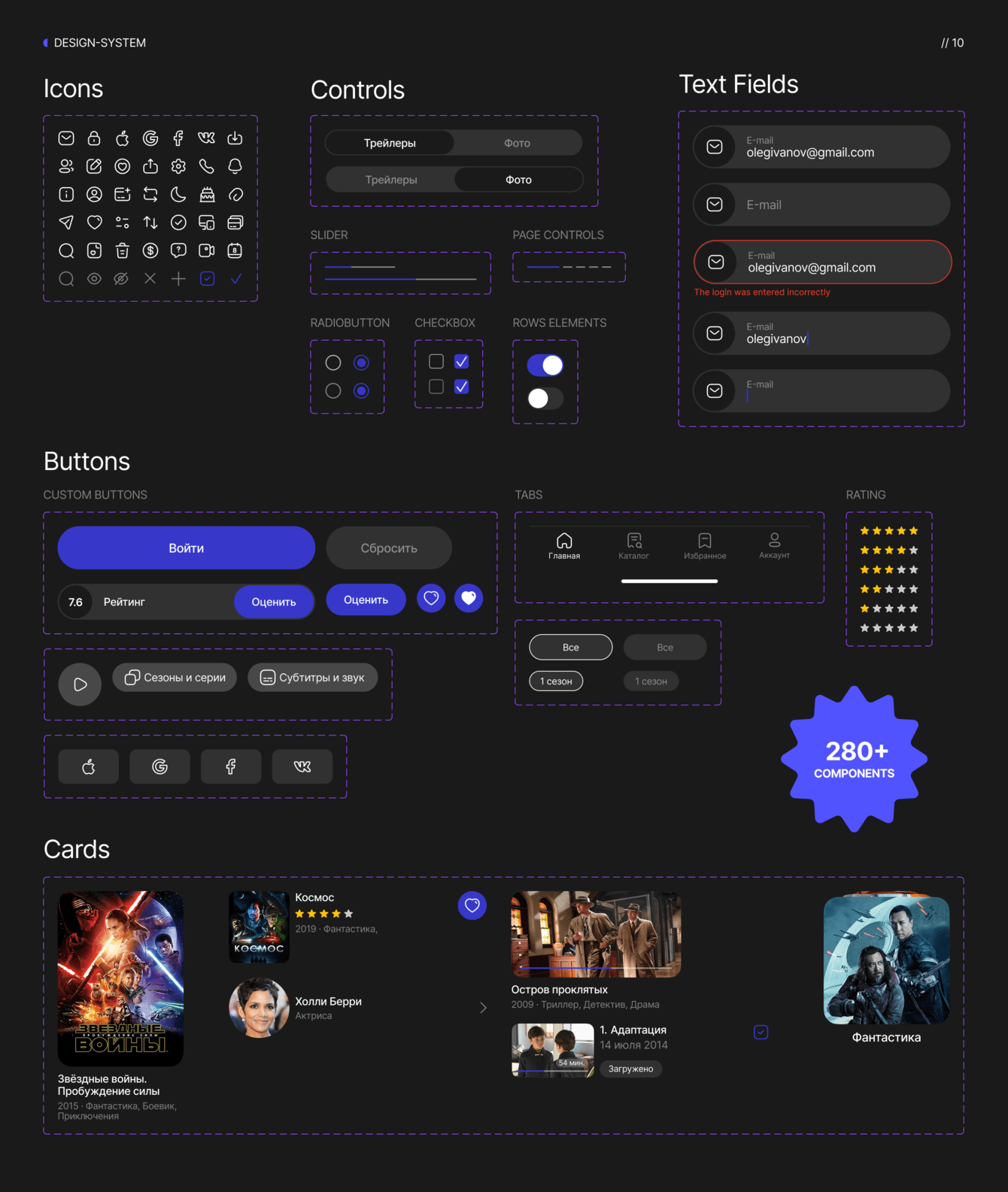 UI Kit: Созданы компоненты, варианты, автолейауты всех основных элементов управления, прописаны все свойства компонентов и затем использованы в приложении.