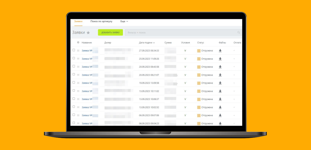 Раздел показывает список заявок, созданных дилером. У каждой заявки отображается статус и файл с документацией, который можно скачивать не переходя внутрь самой заявки.