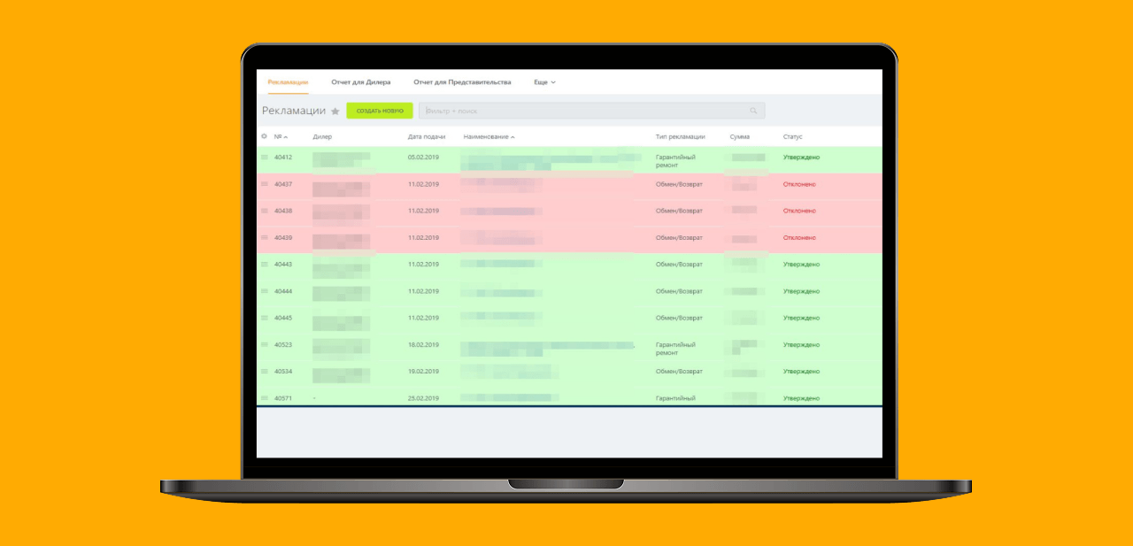 С помощью данного интерфейса сотрудники могут обрабатывать рекламации, распределяющиеся в хронологическом порядке. В таблице отображается текущий статус и визуальная цветовая маркировка строки каждой рекламации.