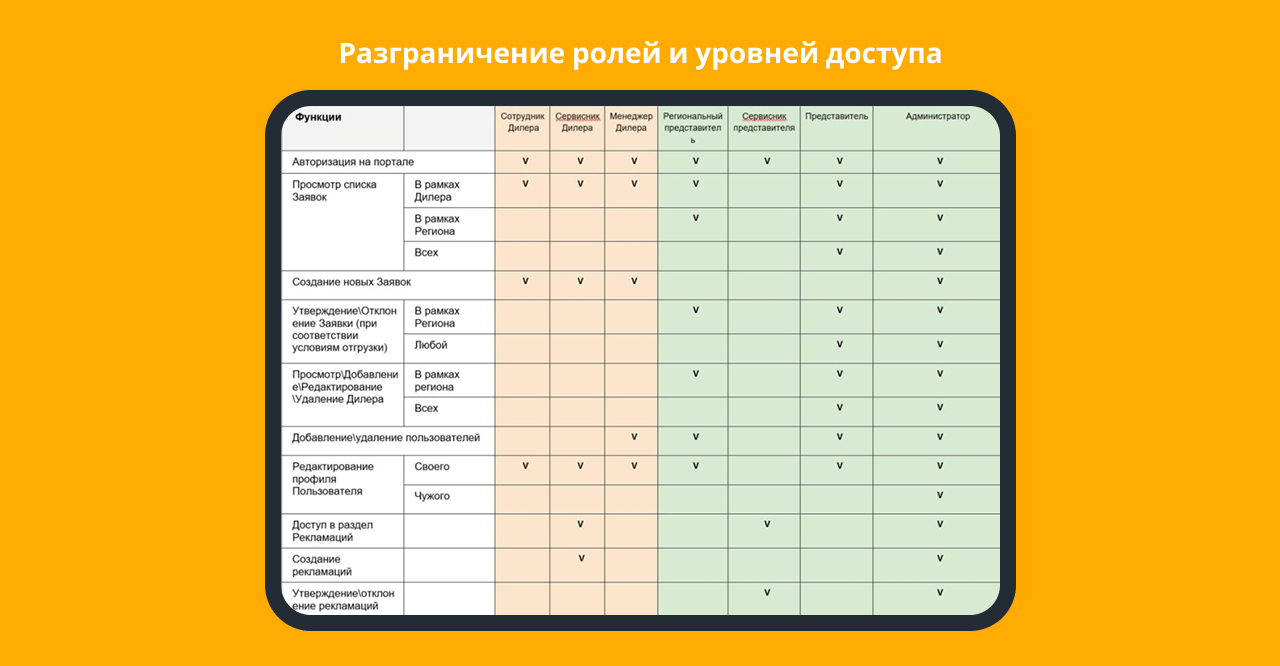 Для эффективной работы на портале для сотрудников компании и дилеров разработаны ролевые модели: