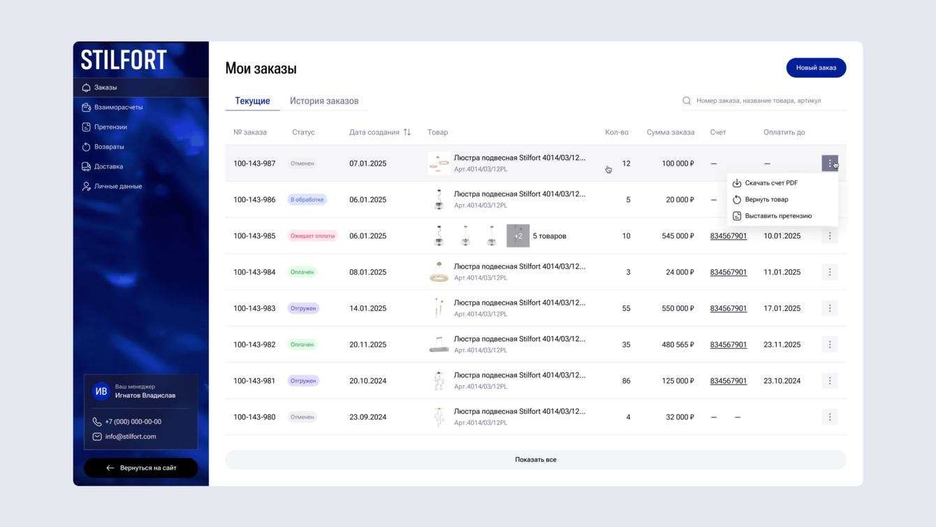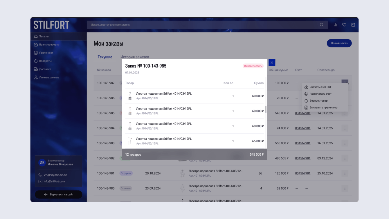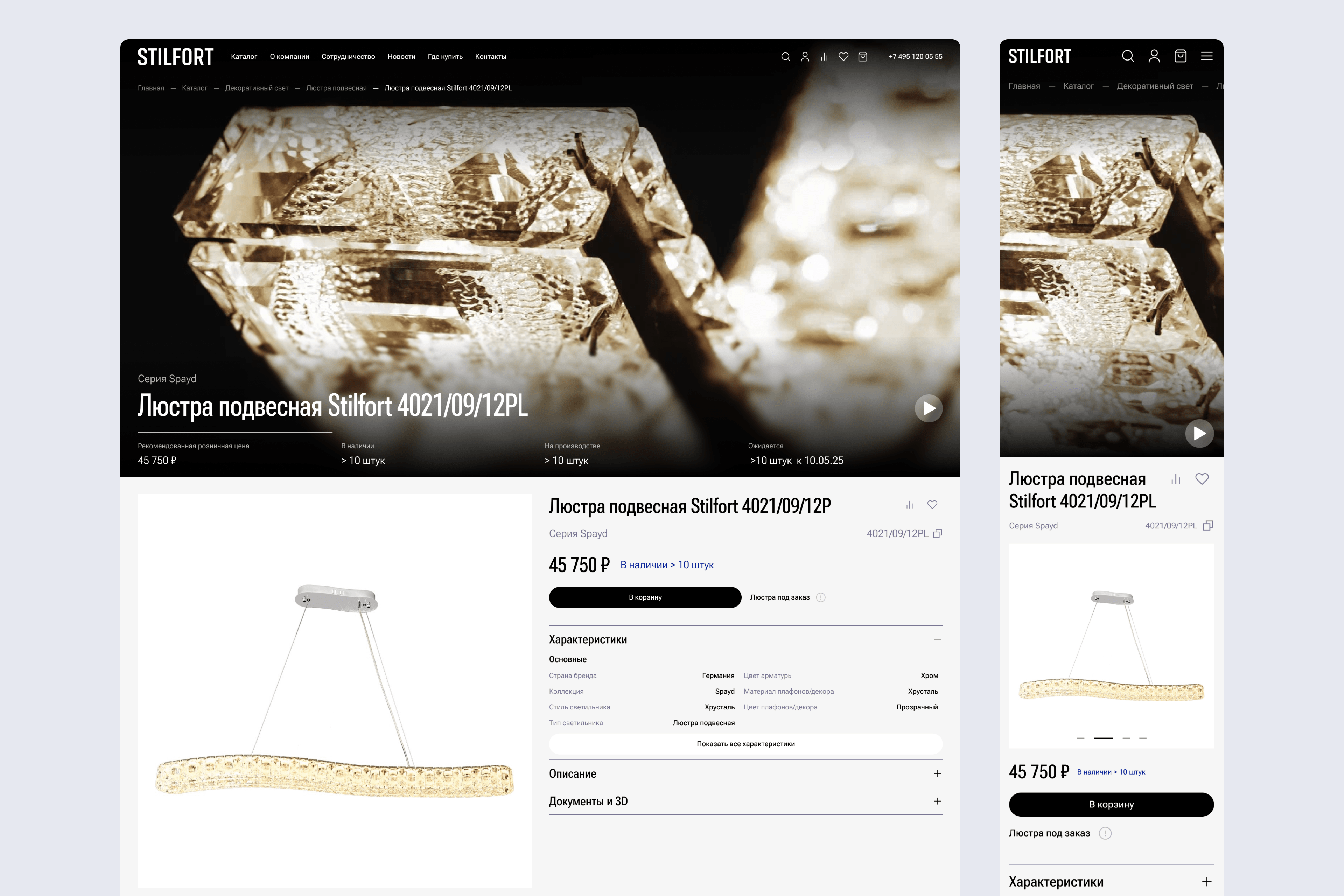 Мы разработали для бренда Stilfort современный интернет-магазин декоративного освещения, который одновременно решает две задачи: демонстрирует продукцию и служит рабочим инструментом для оптовых партнёров.