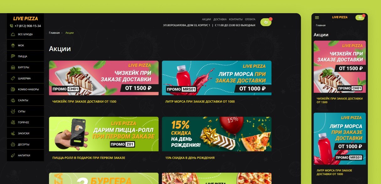 Несмотря на название, в меню ресторана присутствует не только пицца. Заказать можно и бургеры, и шаверму, и вок, и классическую кухню. Нам нужно было сохранить все разнообразие меню, при этом подать его лаконично и упорядоченно, чтобы у посетителя сайта не разбегались глаза.