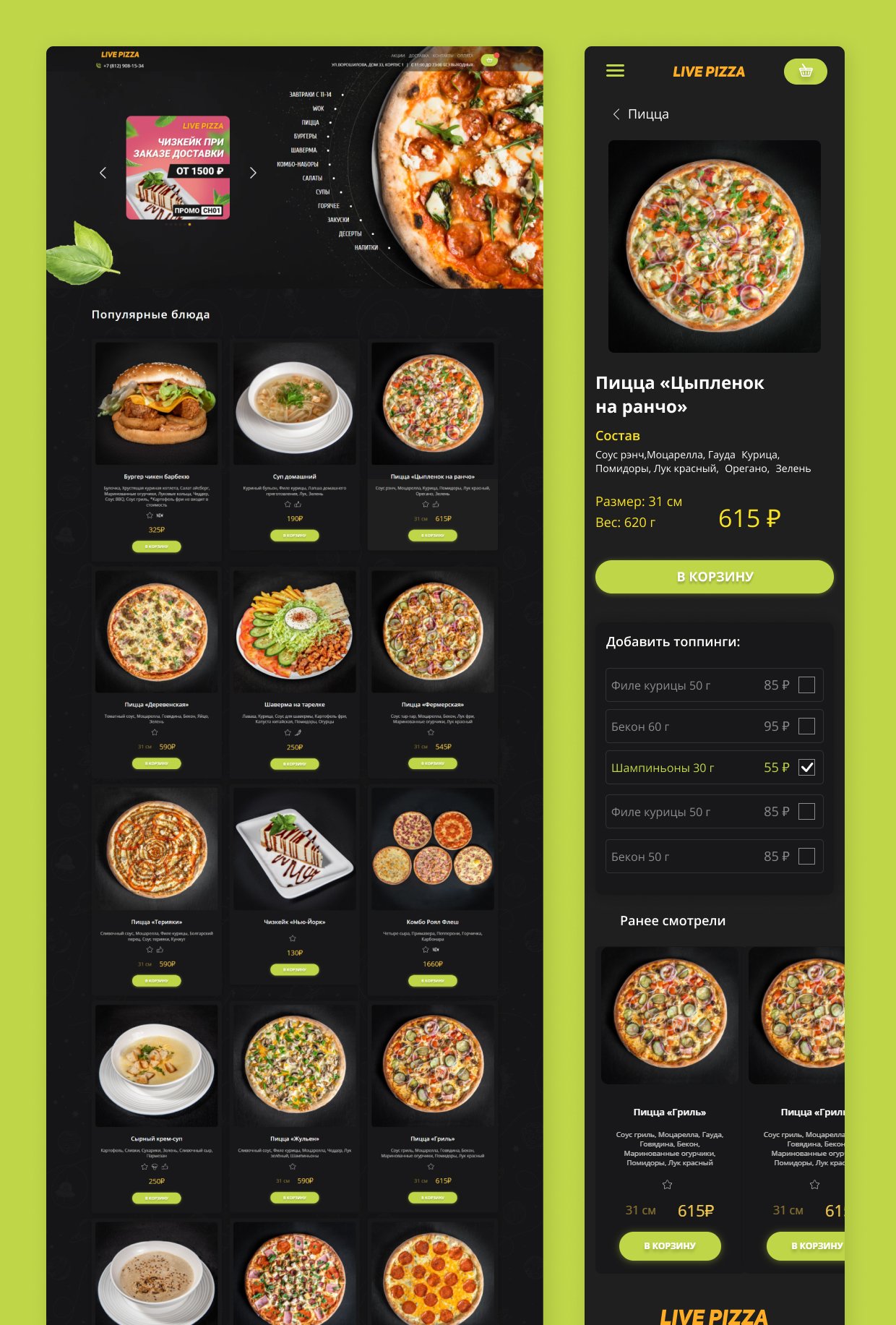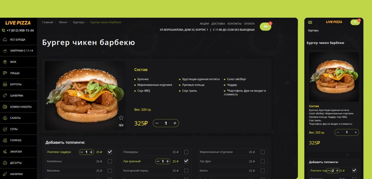 Мы особенно горды необычным меню выбора топпингов. При заказе пиццы, шавермы или бургера, сайт предлагает выбрать дополнительные ингредиенты, которые будут включены в заказ.