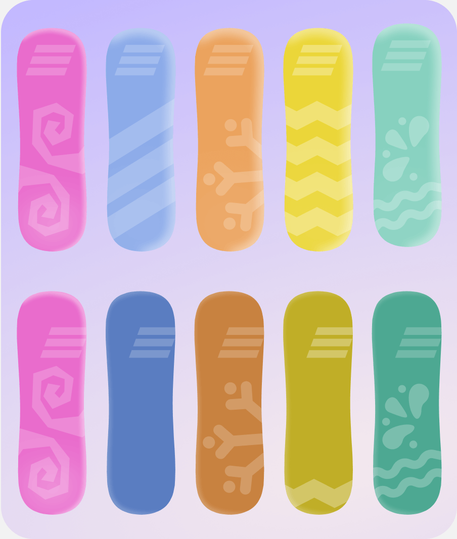 Всего в игре их 5. Накапливая очки опыта, пользователь поэтапно открывает 5 уникальных сноубордов — каждый обновляет экипировку персонажа и дает дополнительные награды для улучшения игрового процесса.