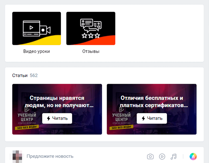 Далее мы переоформили меню группы и главный блок, куда отдельными пунктами вынесли подборки видеоуроков и статей (смотрите на фото). Это сделано для удобства пользователей — теперь им не надо искать по всей страничке конкретный урок или нужную информацию.