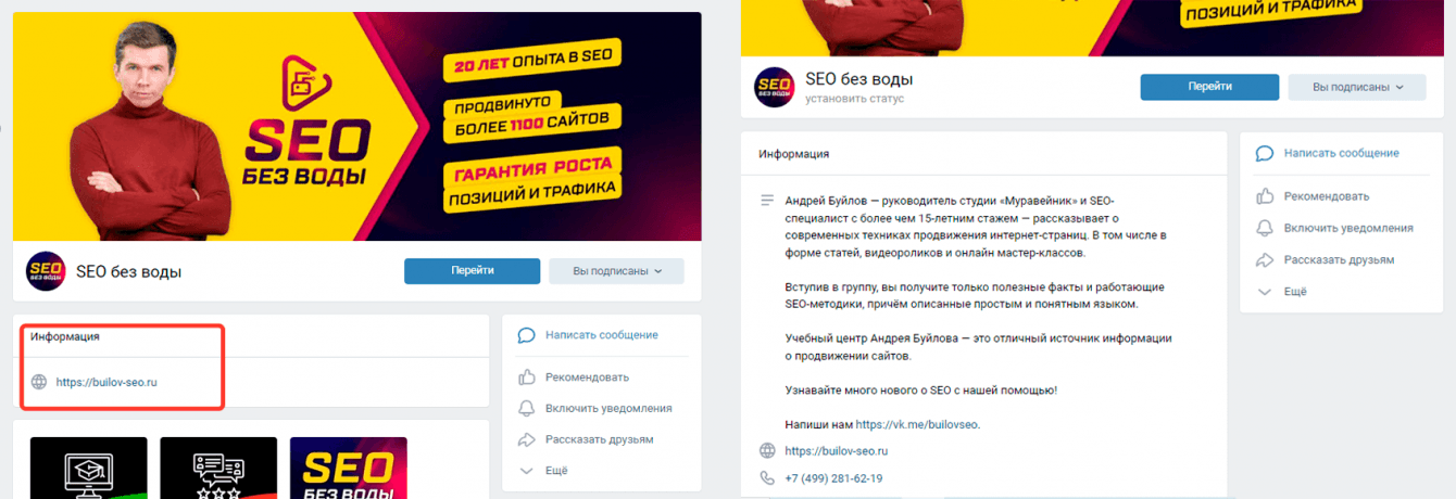 Мы добавили информационный блок — теперь там можно прочитать об авторе группы и тематике, узнать необходимые контакты (телефон, ссылку на сайт).