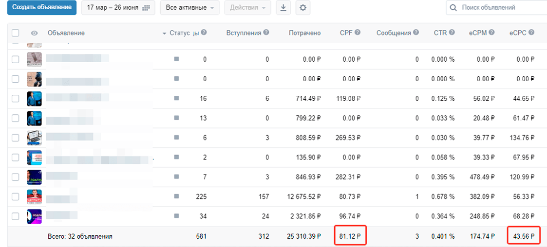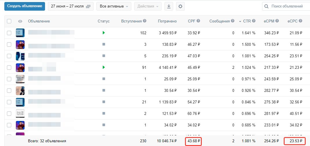 Всего мы протестировали 10 разных креативов и выбрали оптимальный по ряду показателей: CTR (кликабельность), CPC (цена клика), CPF (цена подписчика).