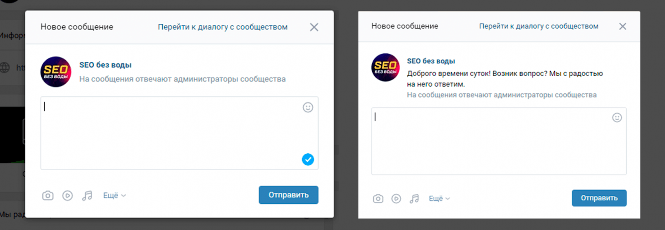 Изменения коснулись и личных сообщений группы. В начало диалога добавили приветствие, чтобы адресно вывести посетителя на общение.