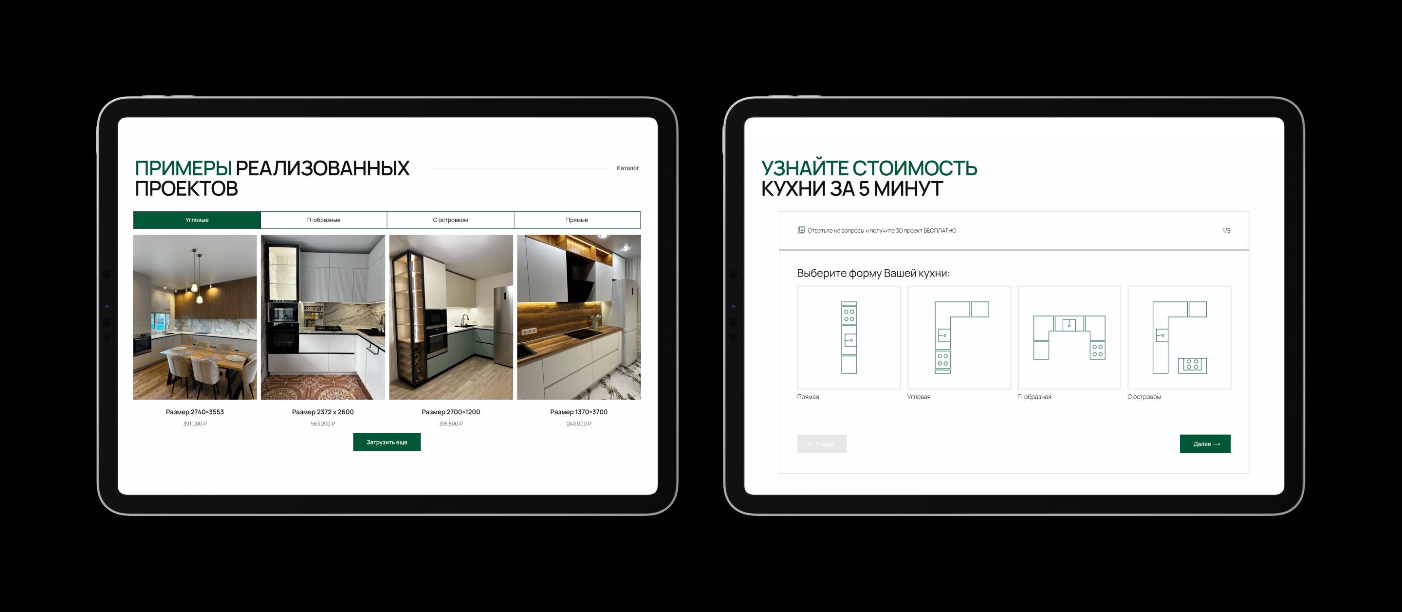 Задача по функционалу была простой и понятной: предстояло сделать слайдер на первом экране, каталог с реализованными проектами кухонь, квиз и классические формы для сбора заявок.