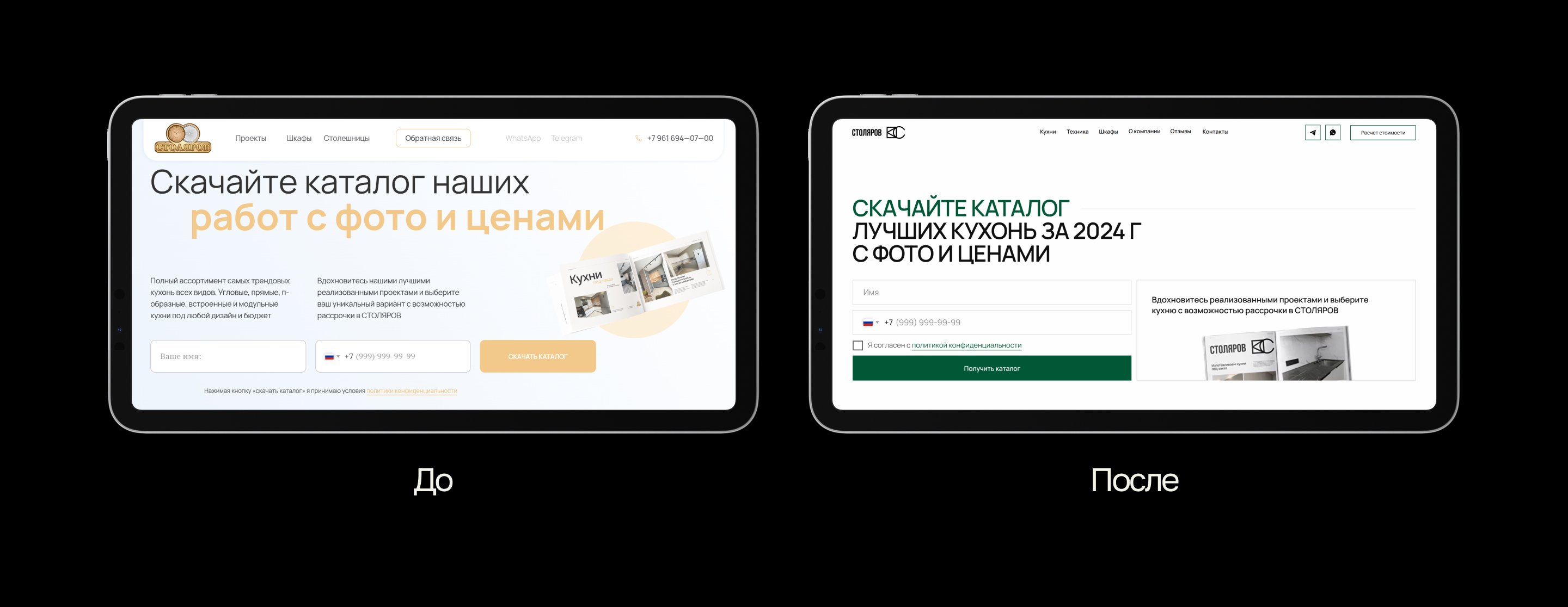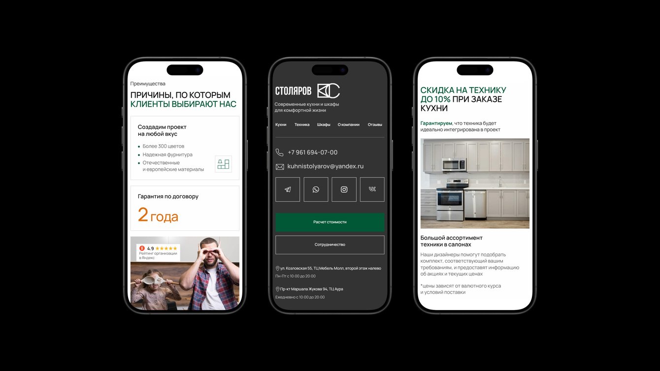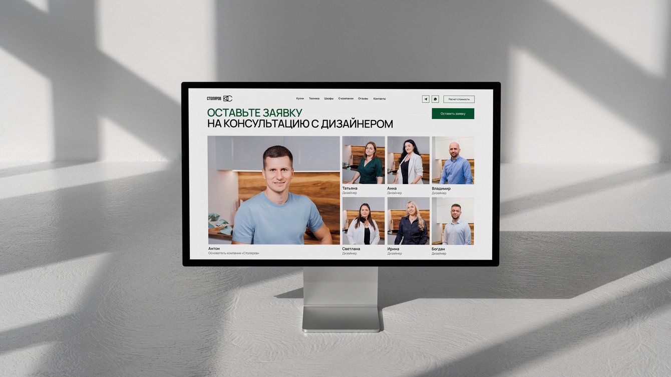 «Столяров» — компания из Волгограда, которая изготавливает кухни и шкафы на заказ. После создания первого сайта прошло 2 года, и бизнес у Антона вырос: проектов стало больше, задачи — сложнее, и само позиционирование стало другим. Всё классно, но сайт по-прежнему показывал компанию из 2022 года.
