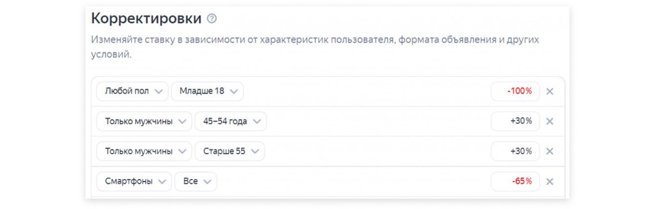 Мы проанализировали данные из Яндекс.Метрики – из отработки рекламных кампаний и органической выдачи. Чаще всего в лид переходили мужчины возрастом 45-55+. Именно на эту аудиторию мы дали повышающие корректировки.