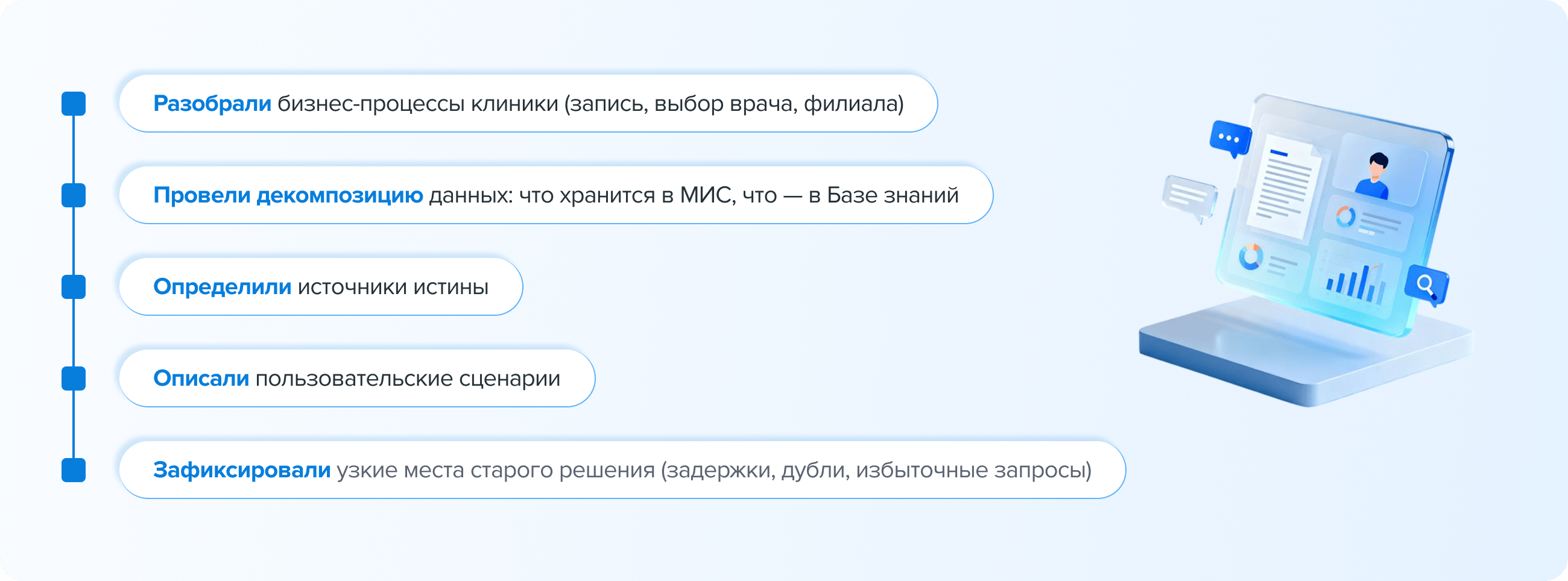 1. Аналитика сущностей: Разделили динамические данные (расписание, свободные слоты в МИС) и статические (биографии, описания услуг в Базе знаний).