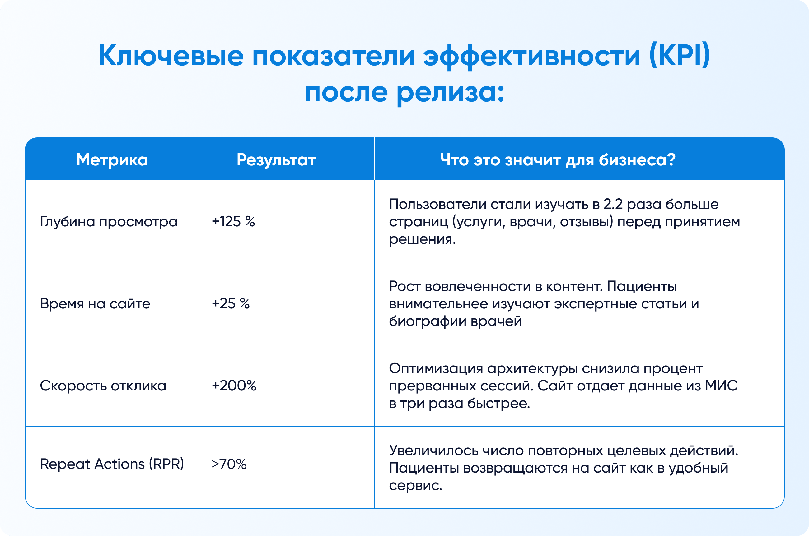 1. Конверсия в запись (CR): Благодаря упрощению пути пользователя и сокращению количества шагов в сценарии записи, мы зафиксировали рост готовности к целевому действию. Интеграция с МИС сделала процесс записи прозрачным и быстрым.