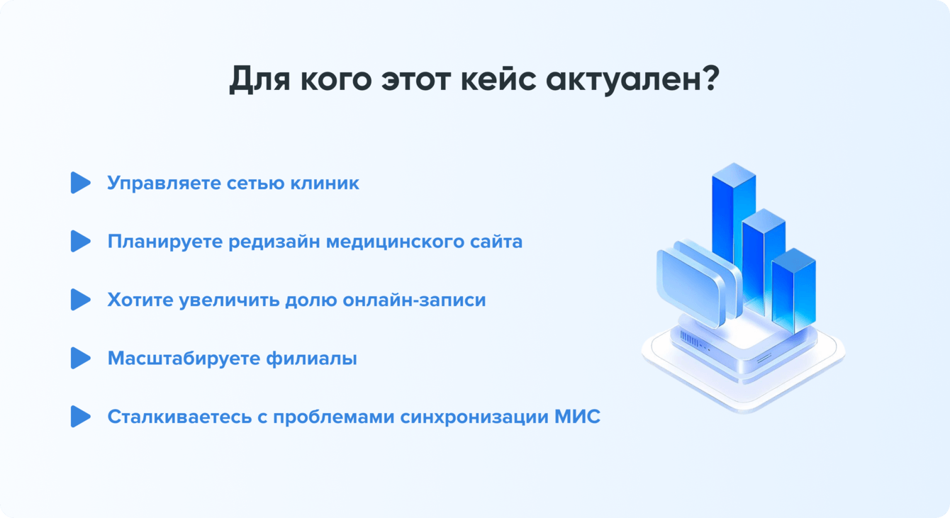 3. Автоматизация как экономия ФОТ: Прямая интеграция с МИС позволила перевести значительную часть записей в онлайн. Это не только удобно для пациента, но и реально снизило нагрузку на регистратуру, позволяя администраторам заниматься сервисом, а не механическим вводом данных.