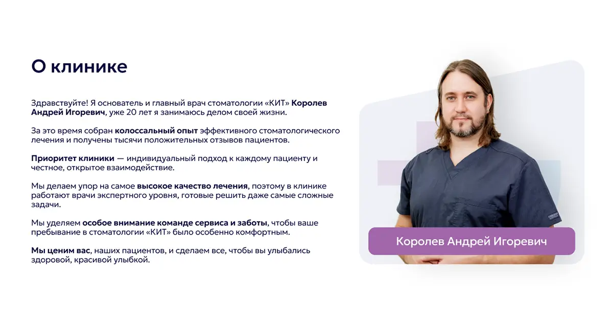 На странице "О клинике" представлен контент, который формирует доверие у клиентов: история клиники, сертификаты, лицензии, награды, информация о применении ИИ, новейшем оборудовании и персональном кураторе. Это подчеркивает индивидуальный подход и соответствие клиники современным стандартам.