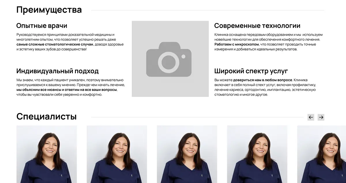 На главной странице клиент сразу получает информацию о преимуществах клиники, знакомится с акциями и отзывами, а также может быстро записаться на консультацию через удобную форму.