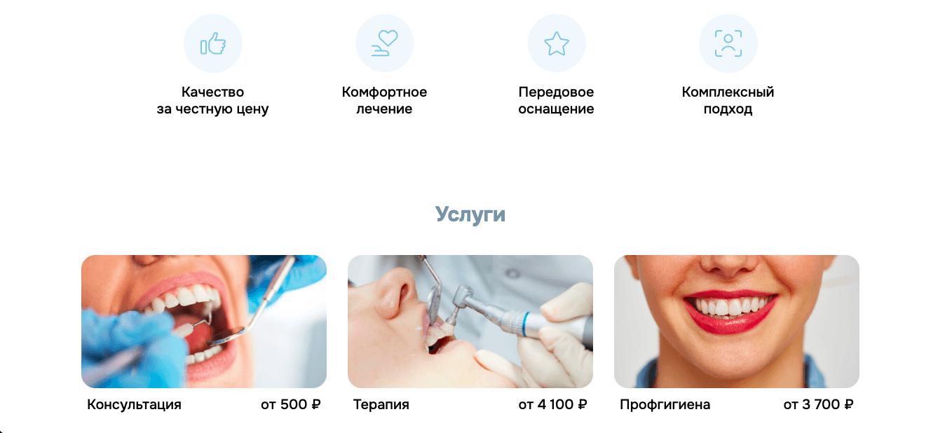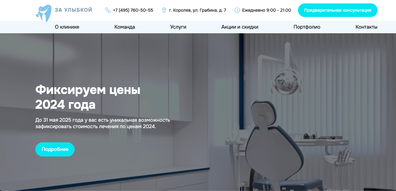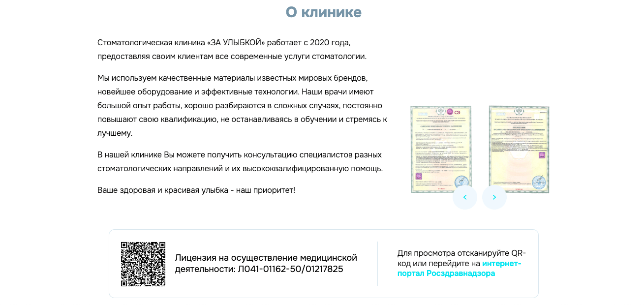Сайт стоматологии с говорящим названием ЗА УЛЫБКОЙ выполнен в корпоративной цветовой гамме, имеет удобный функционал и всю необходимую для пациентов информацию. Реализована форма «Предварительная консультация», где пользователь может отправить заявку и указать удобное для него время посещения. Стоит отметить, что заявки начали приходить сразу после запуска сайта, что очень приятно. Тут, конечно, в большей степени это заслуга клиники и ее репутации. Наша задача была сделать хороший дизайн и надежную техническую базу для сайта и его бесперебойной работы. А трафик по коммерческим запросам скоро тоже будет, после работ по SEO.