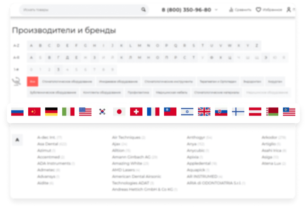 Например, кликнув на флаг Австрии вы получите подборку австрийских брендов стоматологического оборудования.
