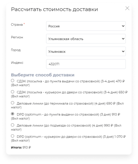 Клиент выбирает выгодный по стоимости и времени доставки сервис прямо на странице оформления заказа.
