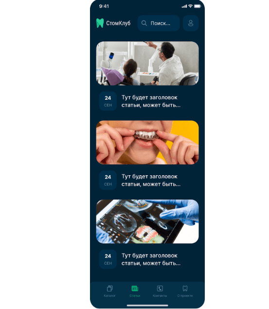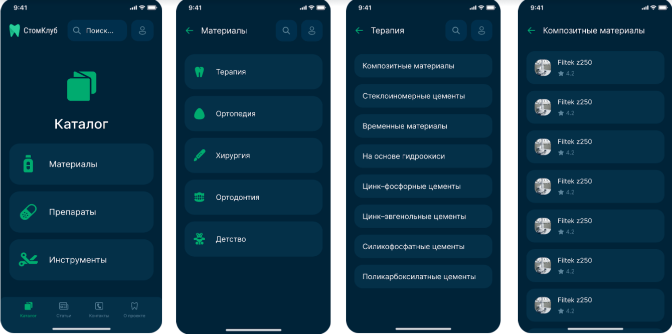 Приложение представляет из себя каталог/информационный портал в области стоматологии.