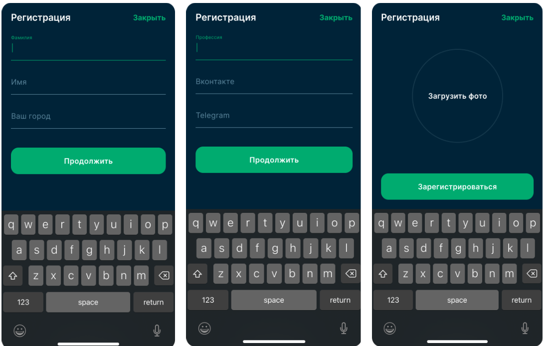 Регистрация осуществляется в три этапа. Первый этап требует от пользователя ввести фамилию, имя и город . Второй - профессию, адреса в сотсетях “vk.com” и “telegram”. На третьем этапе пользователю будет предложено загрузить фото. Второй и третий этапы необязательны и могут быть отредактированы позже, в окне профиля.