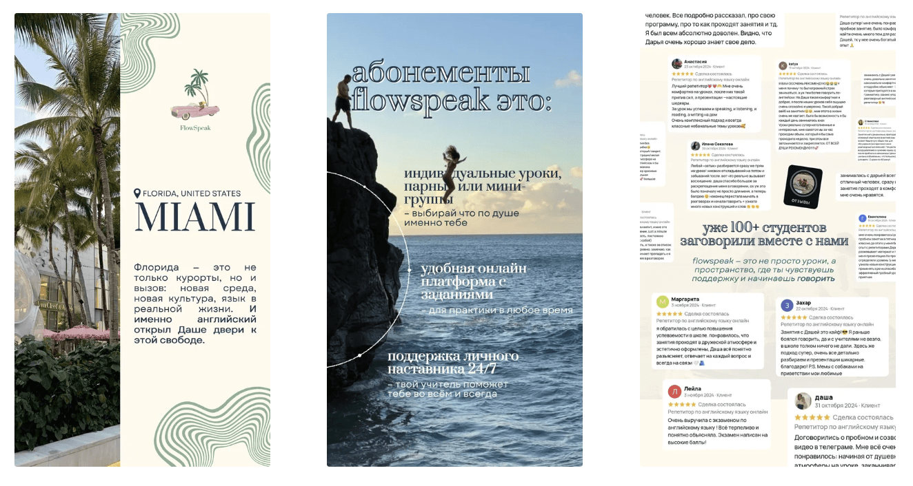В рамках проекта страницы в соцсетях школа получили более 1 000 подписчиков и 30 новых клиентов благодаря креативным кампаниям, тематическим сериям и современным дизайнерским решениям, которые сделали изучение языка живым и актуальным.