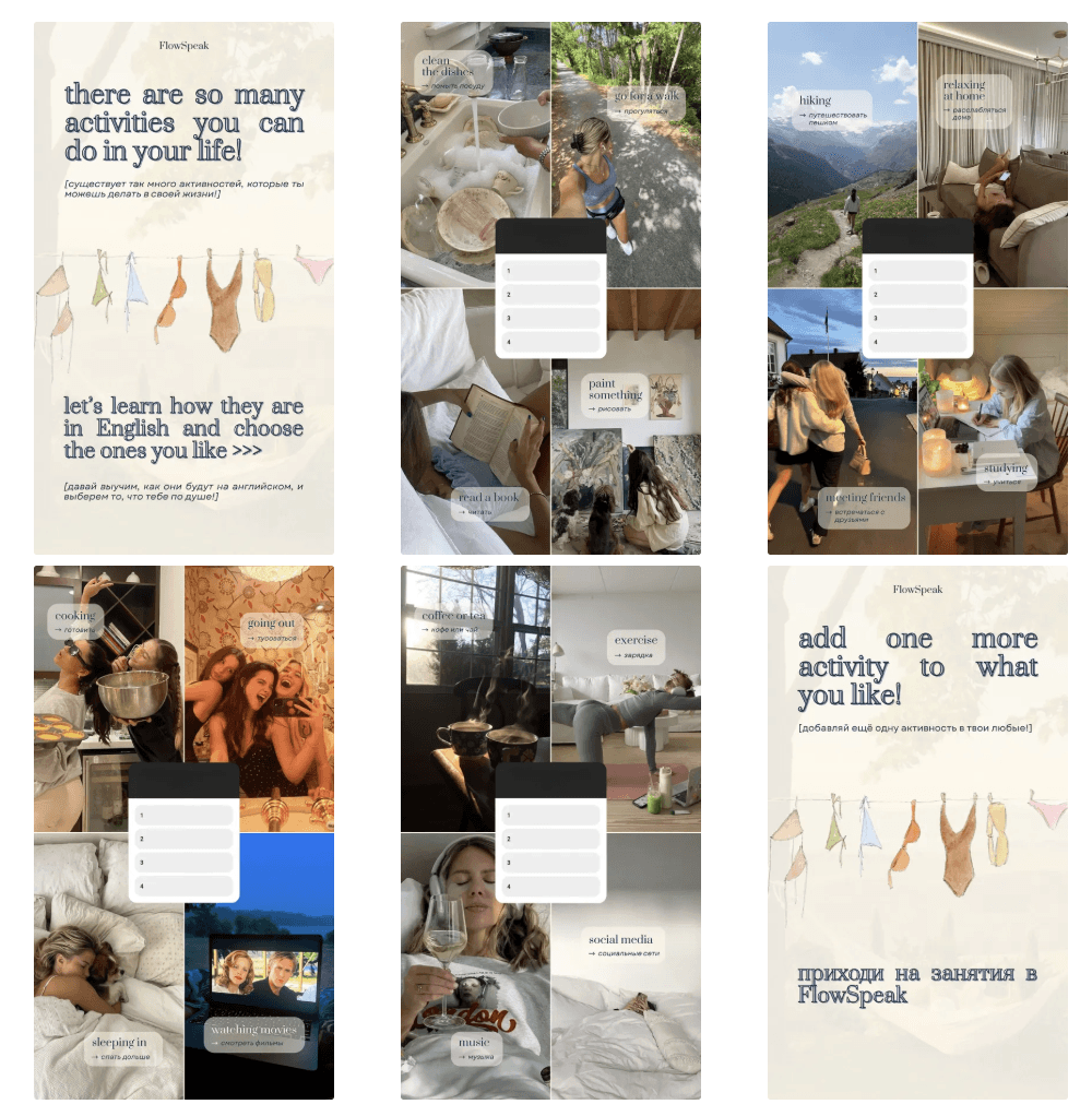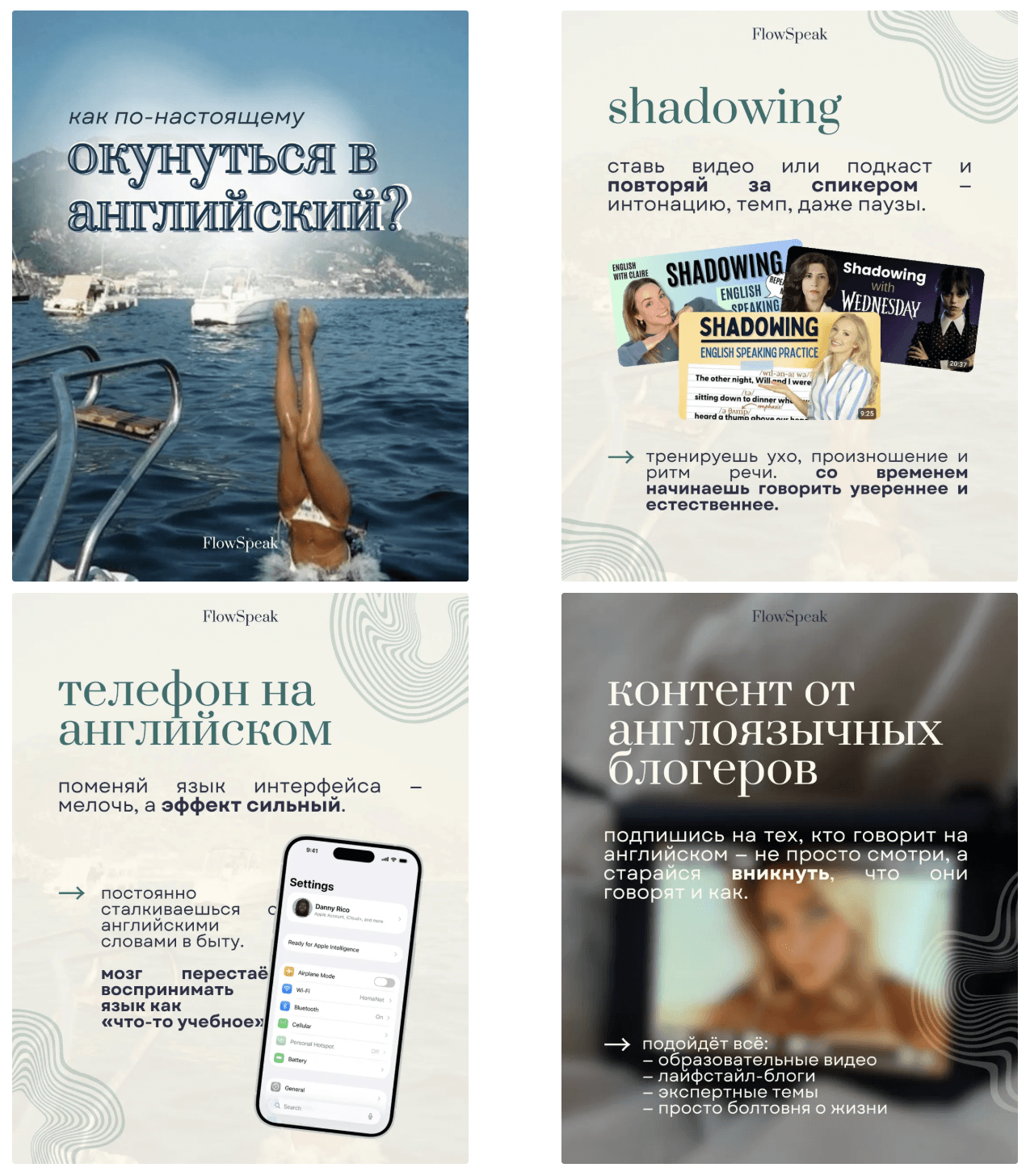 Этот проект включает все визуальные материалы для Instagram* и Telegram, созданные для школы FlowSpeak — школы английского языка. Цель заключалась в том, чтобы создать единый, узнаваемый визуальный стиль, который бы откликался у аудитории поколения Z, при этом сохраняя образовательный и вовлекающий формат контента.