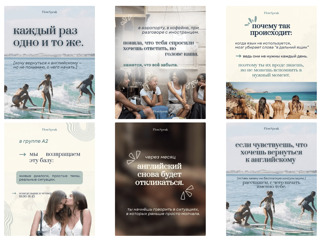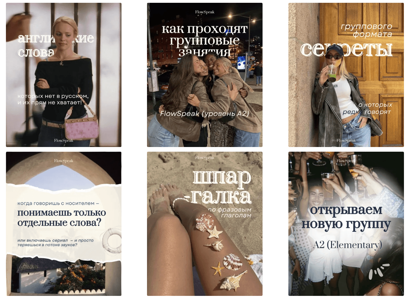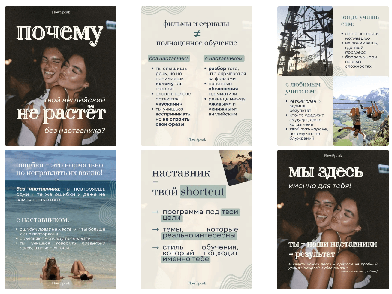 Этот проект включает все визуальные материалы для Instagram* и Telegram, созданные для школы FlowSpeak — школы английского языка. Цель заключалась в том, чтобы создать единый, узнаваемый визуальный стиль, который бы откликался у аудитории поколения Z, при этом сохраняя образовательный и вовлекающий формат контента.