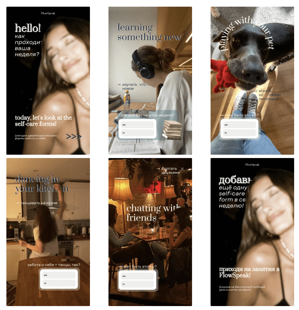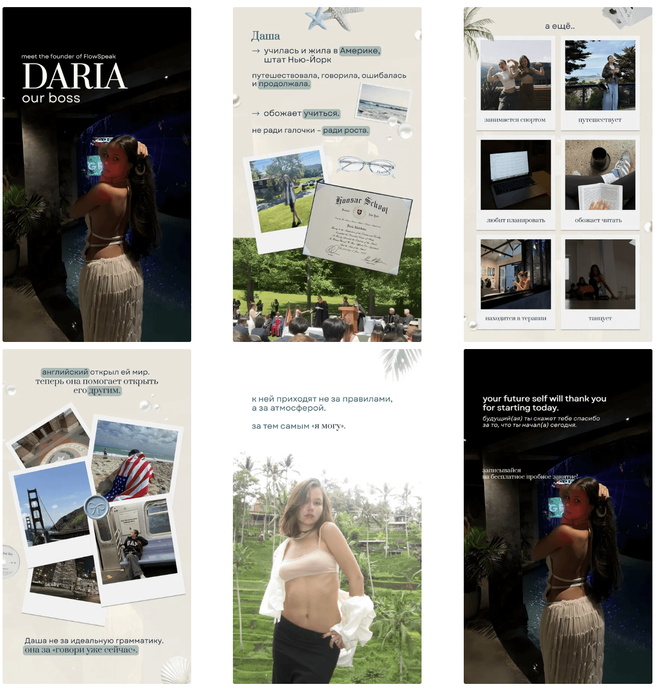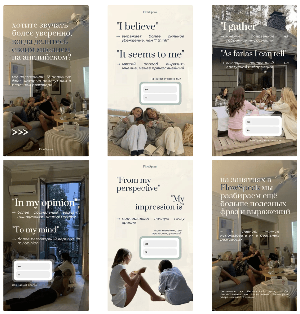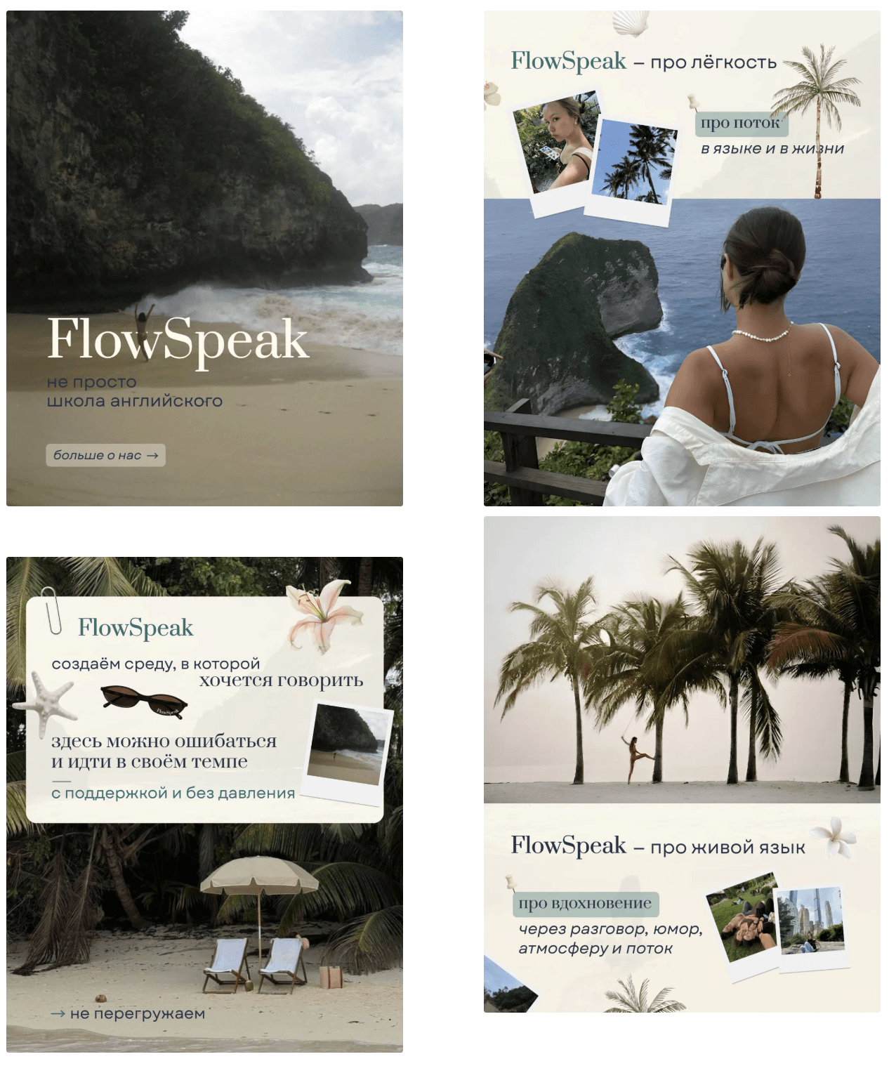 Этот проект включает все визуальные материалы для Instagram* и Telegram, созданные для школы FlowSpeak — школы английского языка. Цель заключалась в том, чтобы создать единый, узнаваемый визуальный стиль, который бы откликался у аудитории поколения Z, при этом сохраняя образовательный и вовлекающий формат контента.
