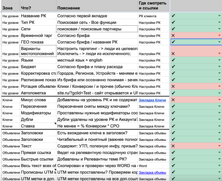 Ниже фрагмент чек-листа с анализом эффективности рекламных инструментов кампании одной из кампаний Google Ads.