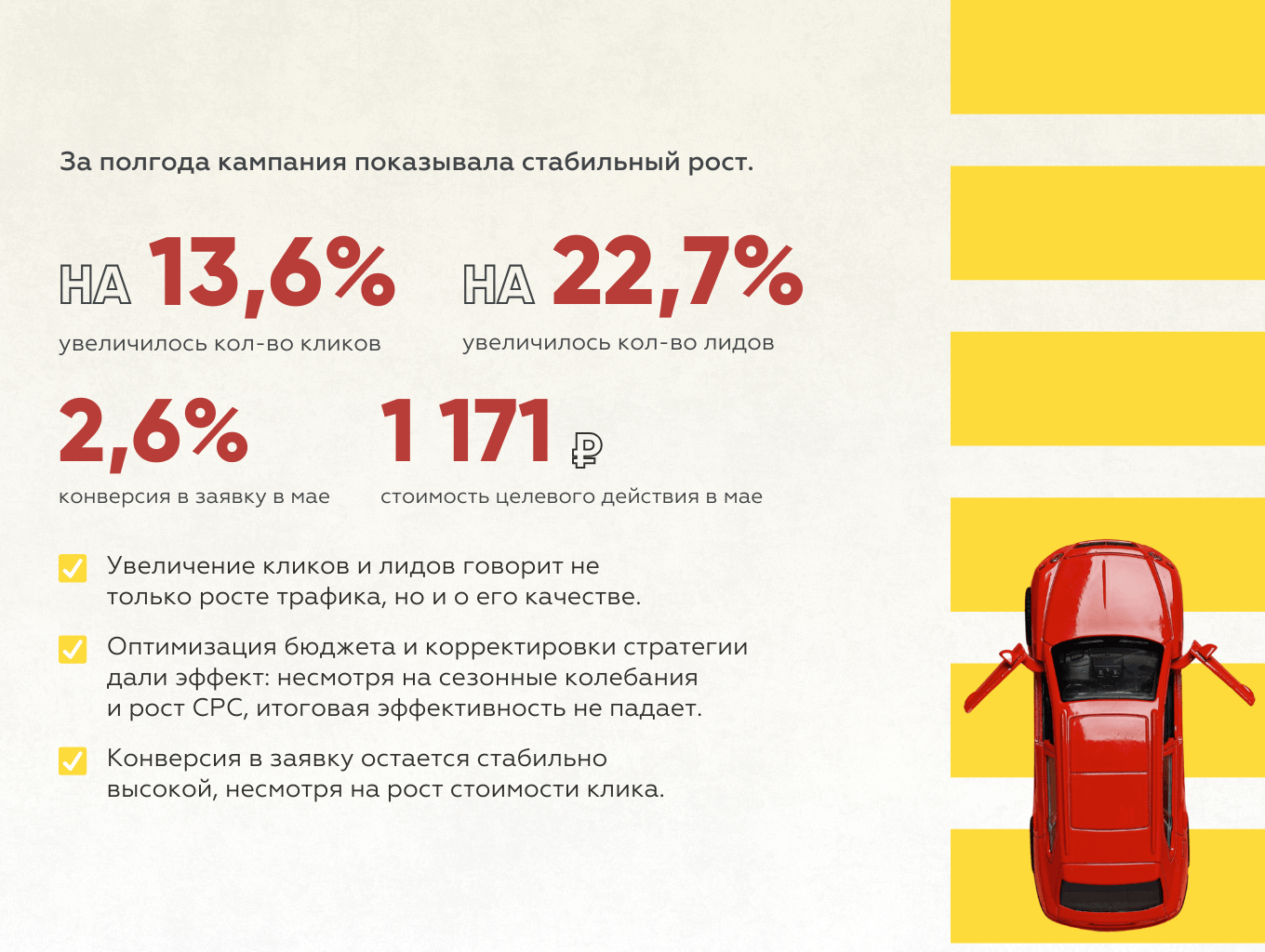 ➤ Получили качественный трафик: на 13,6% выросло количество кликов, а лидов — на 22,7%.