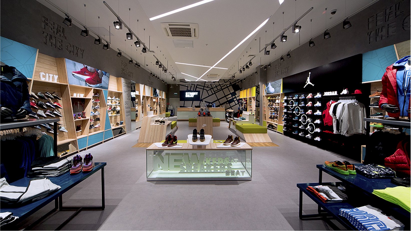 Интерьер магазина также ассоциируется с большими городами. Основные материалы — это бетон и дерево. Несмотря на их различие в фактуре, они органично дополняют друг друга.