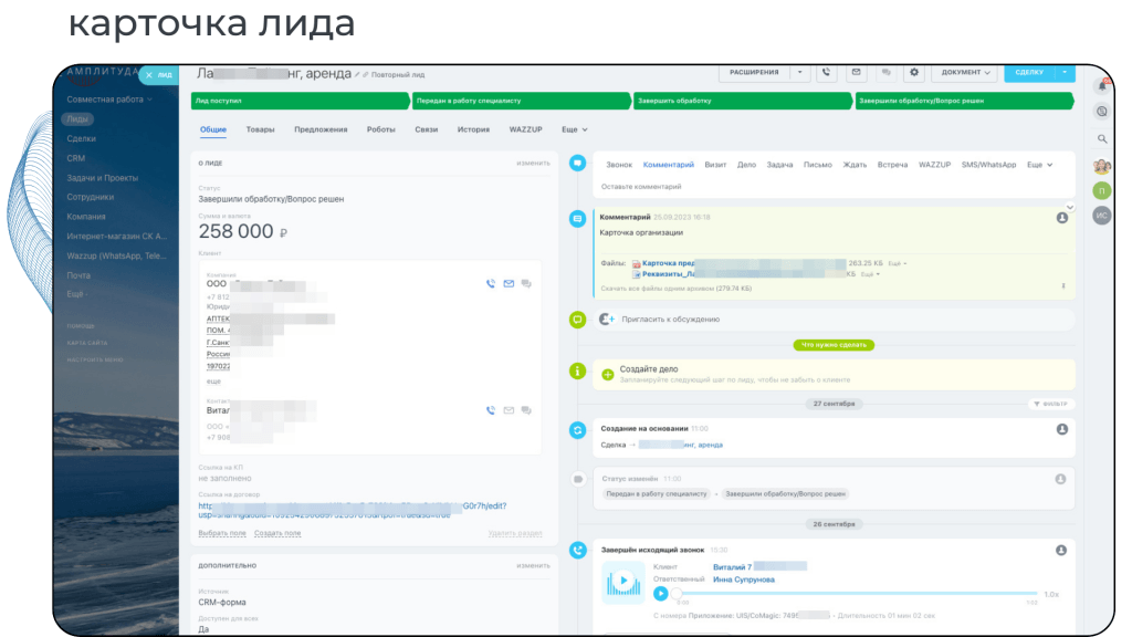 При переходе непосредственно к карточке клиента менеджеры видят все данные, начиная от статуса процесса работы над заявкой до записи звонков, документов по заявке. Ниже приведены наглядные примеры данных процессов.
