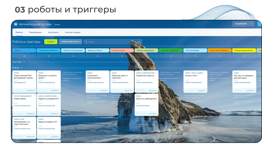 Далее мы внедрили ряд функций, которые автоматизируют продажи в проекте и помогают освободить менеджеров проекта от рутинных действий. Например, вам при поступлении заявки нужно запросить определенную информацию у клиента. Робот в таком случаи сам отправляет за вас материалы по назначенному истечению времени. А так же он автоматически прикрепляет нужного сотрудника к проекту. В данном случаи подключает строителя в сделку. Далее добавляет ответственного наблюдателя - юриста и прикрепляет чек-лист по передаче документации.