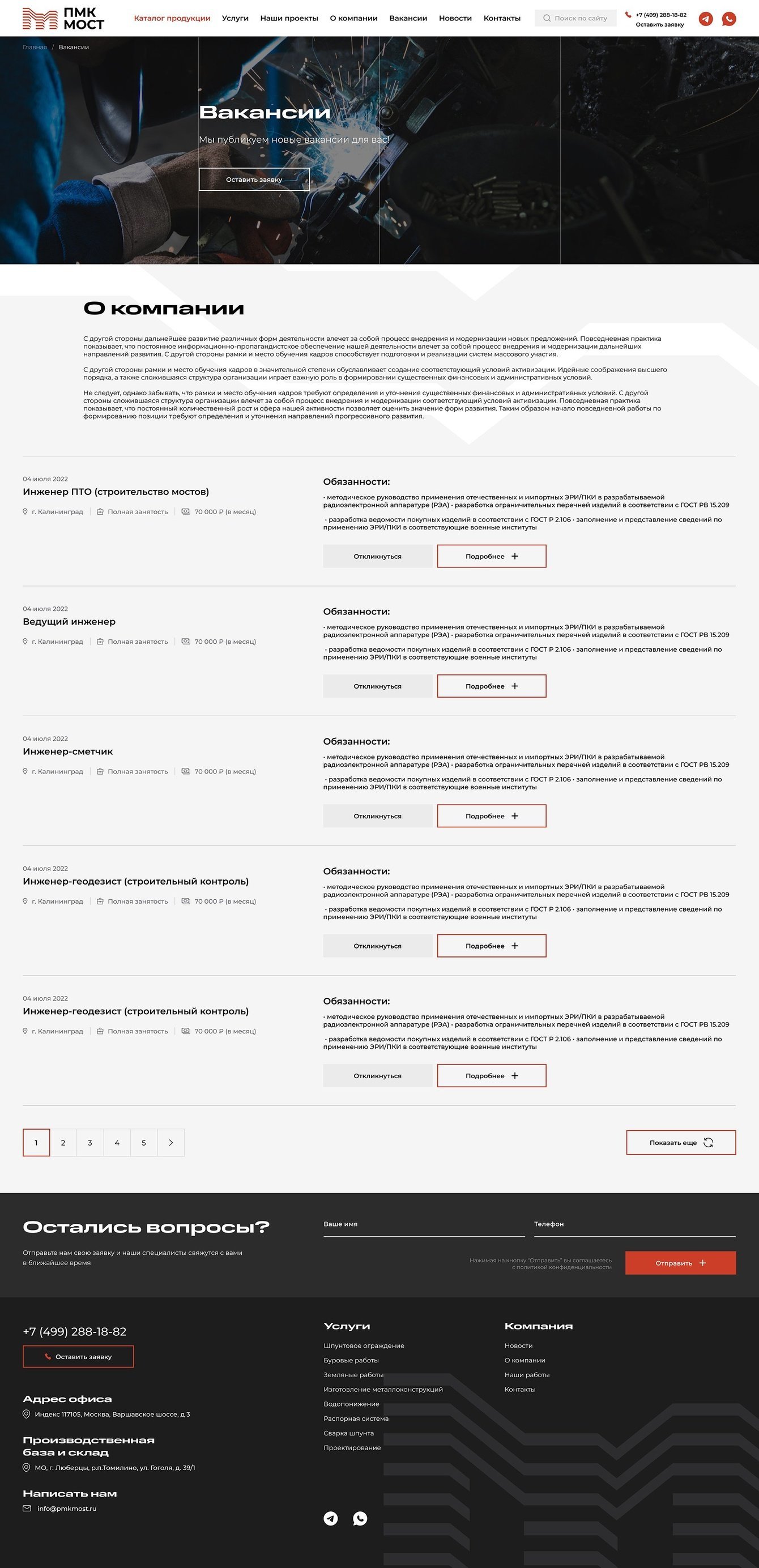 Разработан раздел «Вакансии» с возможностью оставить заявку на работу и прикрепить резюме. Также разработан квиз для расчёта стоимости работ.