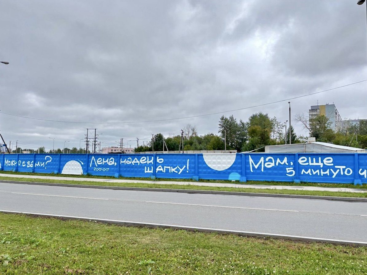 Реплики из дворового детства мы усилили стилем оформления: предложили «Орсо групп» написать их от руки. В этом есть и практическое значение: строительные заборы нередко становятся «холстом для вольных городских художников», а здесь уже всё написано — и добавить нечего.