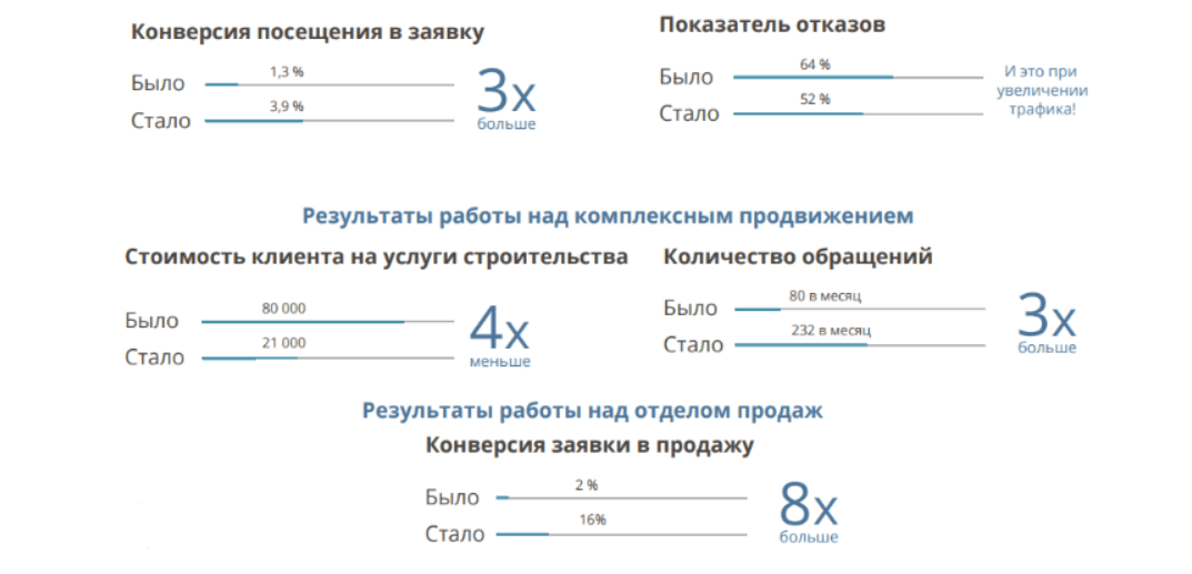 С корпоративными сайтами задача была интереснее. На них заходил органический трафик, более 700 страниц в индексе, конверсия в среднем составляла 1,2%. И наша задача была не только сделать лучше, но и не потерять текущие показатели.