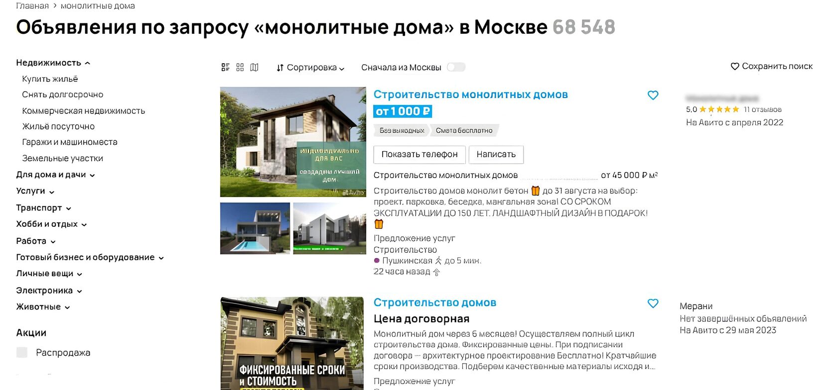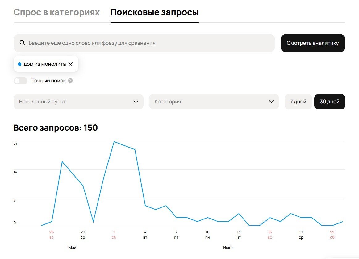 Мы также проанализировали рынок: в выдаче Авито было более 60 000 объявлений от конкурентов (как профильных, так и тех, кто строит из других материалов). При этом общий спрос на монолитные дома в регионе был низким — около 150 запросов в месяц. Стало очевидно, что для успеха нужно не просто быть лучше, а доминировать в выдаче.