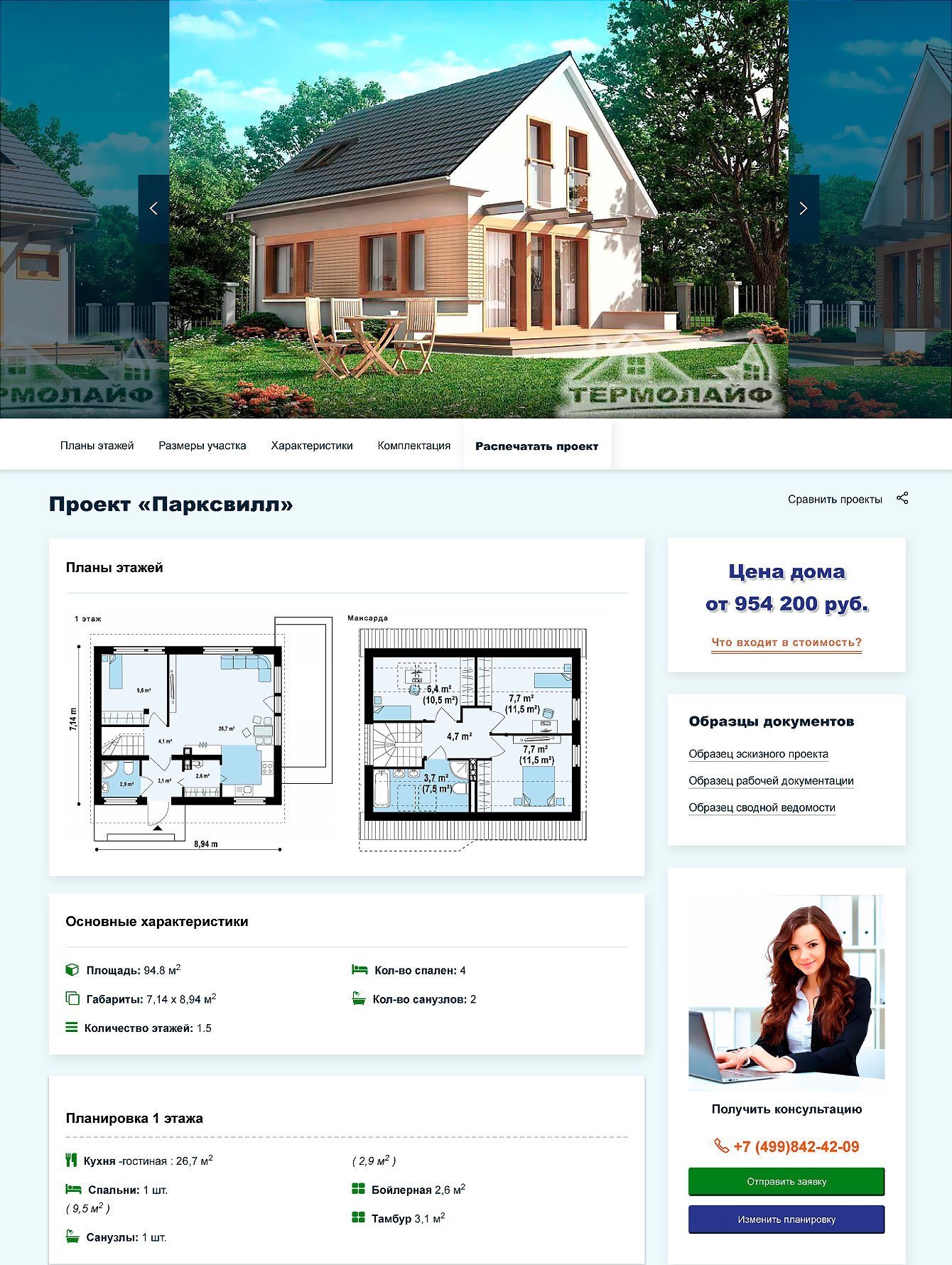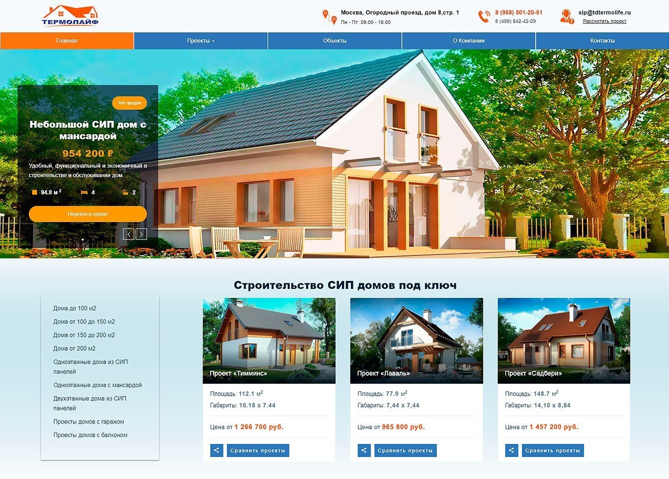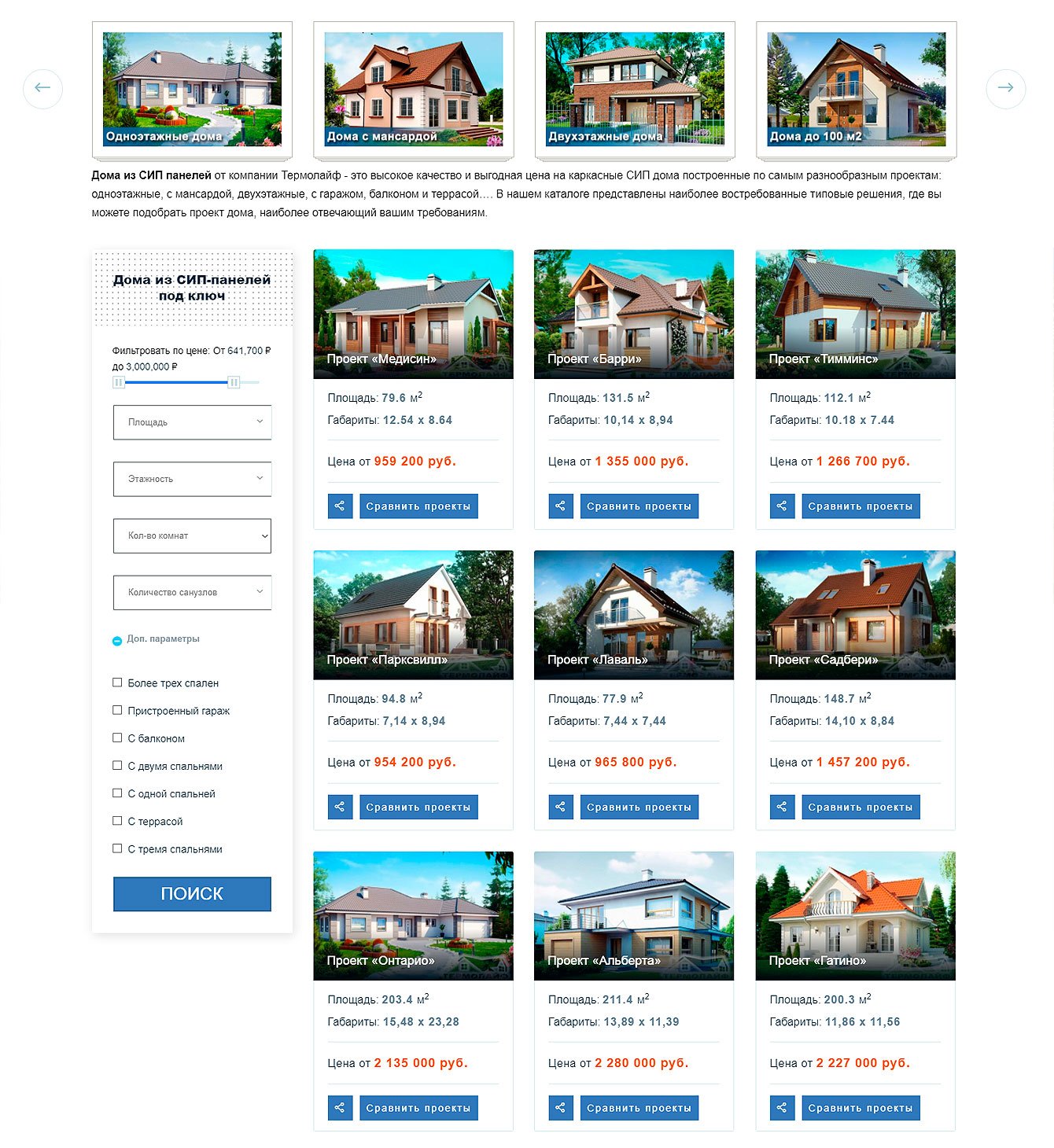 Создание сайта по строительству сип домов с двумя фильтрами: расширенным фильтром выбора типовых проектов и фильтрацией построенных объектов. Полная техническая и внутренняя оптимизация.