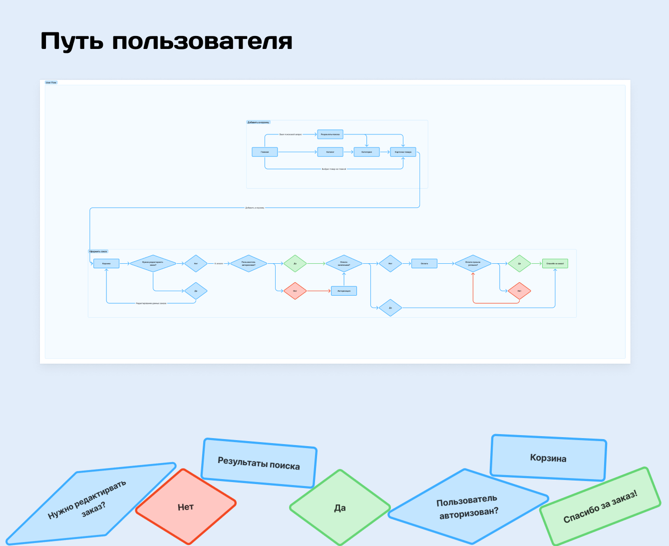 Оформили путь пользователя и определили, где в будущем будем расставлять визуальные акценты.
