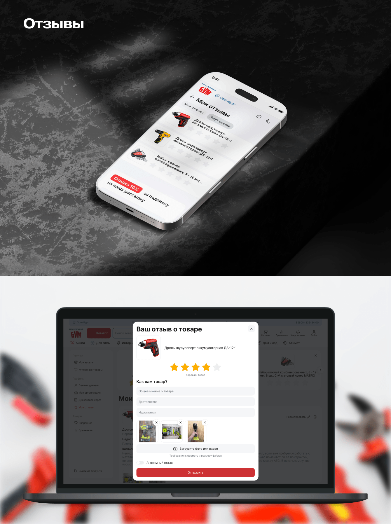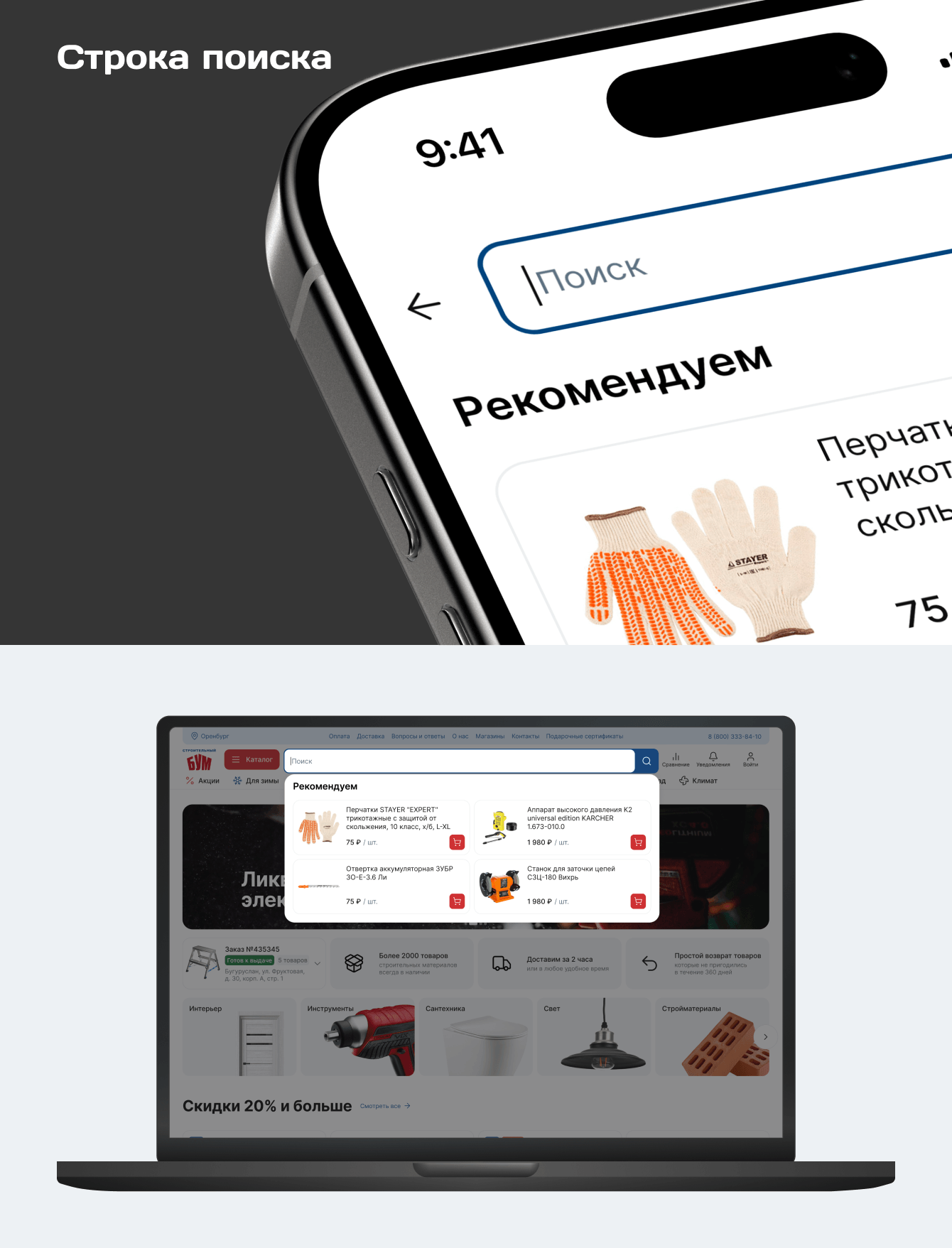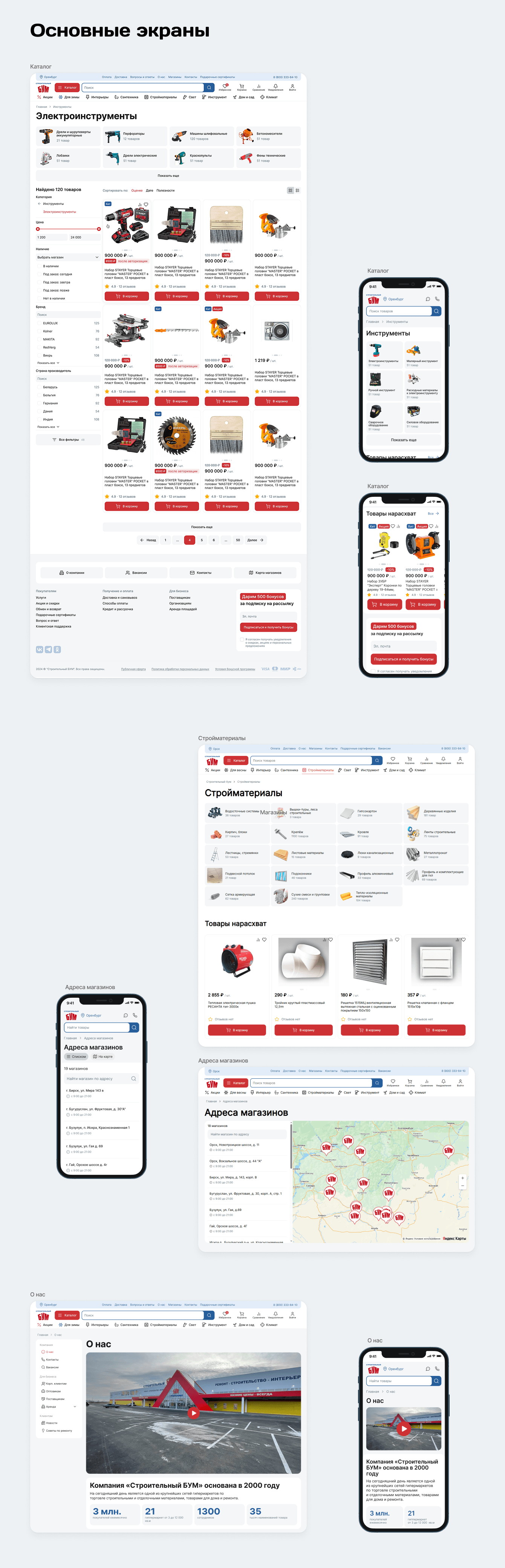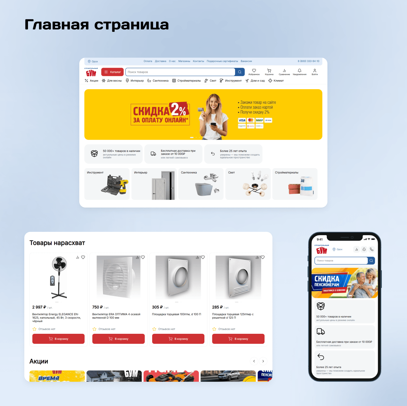 В «СтройБУМе» 100 000+ товаров, поэтому дизайн должен был не отвлекать от главного, а помогать выбирать. При этом важно было сохранить ДНК бренда: перенести айдентику офлайн-магазинов в диджитал и собрать современный, понятный интерфейс.