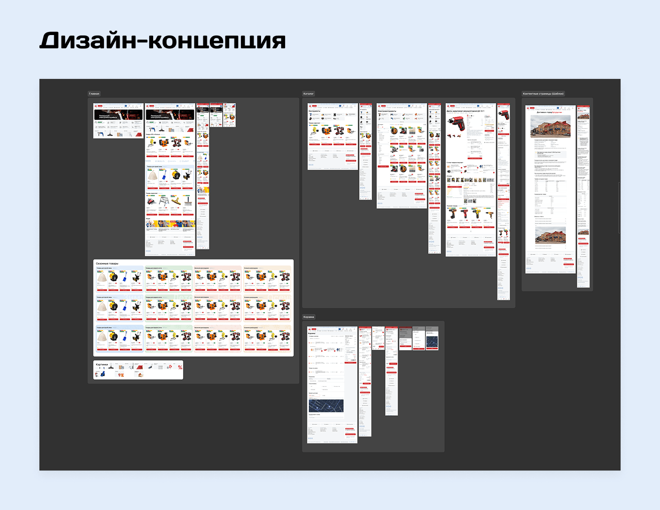 Переложили архитектуру на кликабельные прототипы, чтобы наглядно показать клиенту как будет работать интернет-магазин. Согласовали экраны и перешли к разработке визуала.