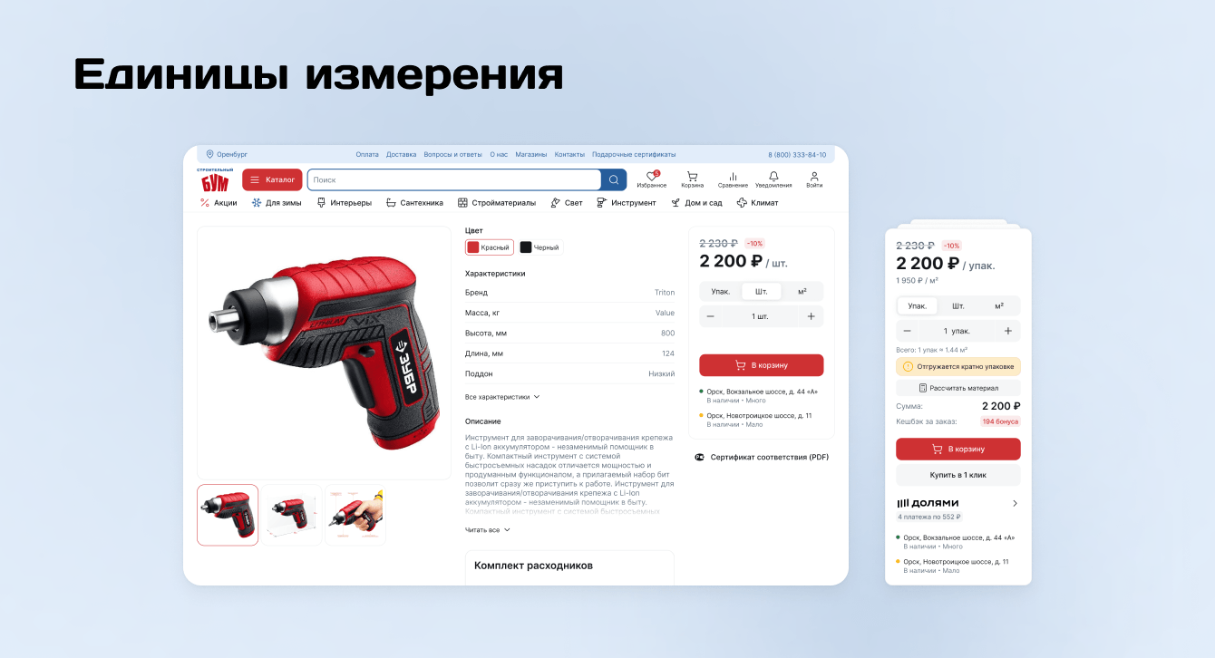 На сайте используется множество номенклатур и единиц измерения, которые подтягиваются из 1С. Мы настроили логику пересчёта: система умеет конвертировать значения и упрощает расчеты. Например, зная квадратуру помещения, можно быстро понять, сколько потребуется погонных метров материала. Получилась MVP-версия умного калькулятора, который помогает покупателям правильно рассчитывать кратность упаковки строительных материалов.