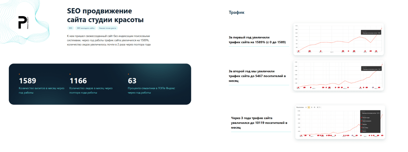 - За первый год трафик увеличился на 1589% (с 0 до 1589 визитов в месяц).